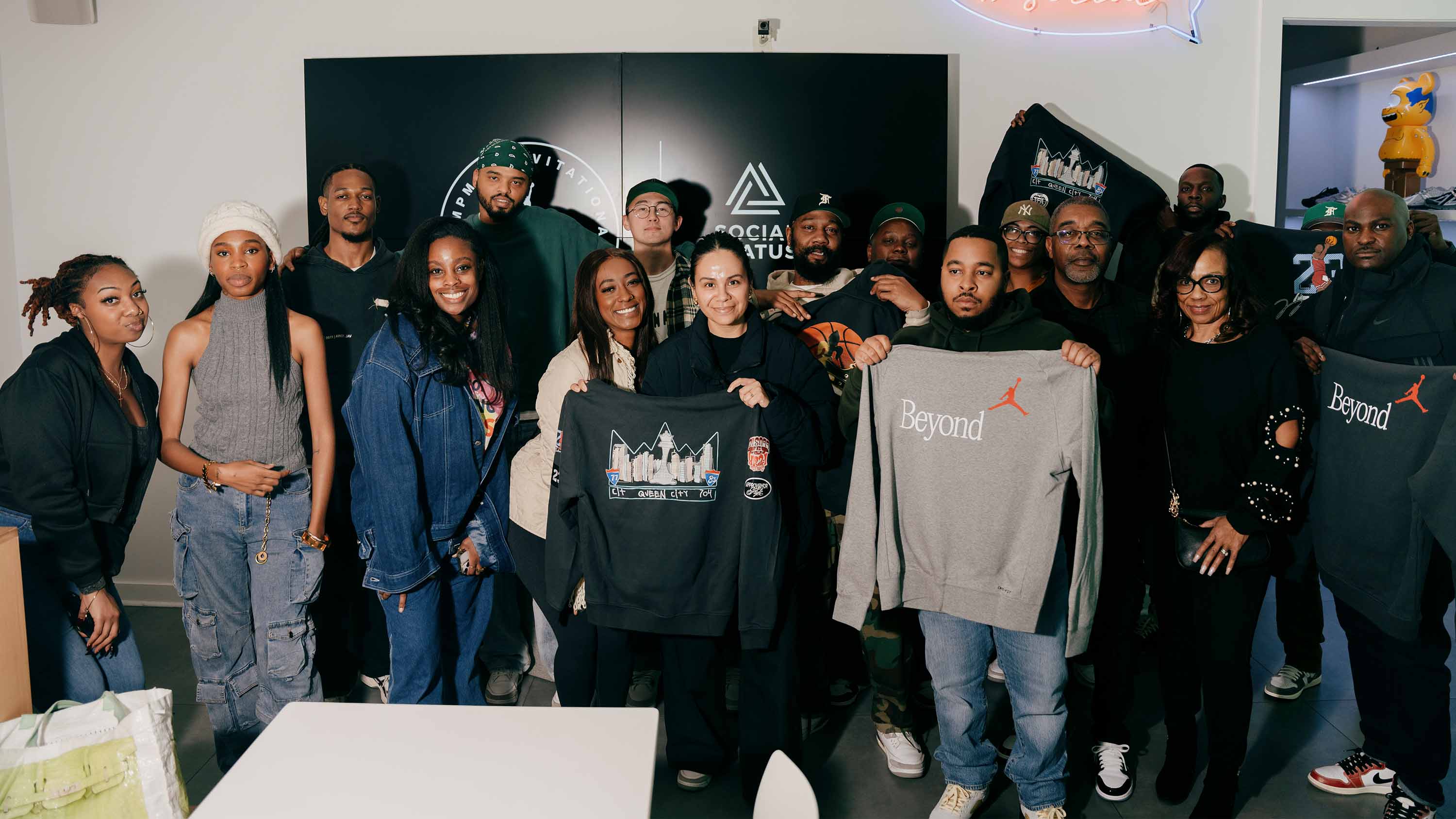 The 2023 Jumpman Invitational returns to Queen City. In collaboration with the Jordan Brand, beSocial and Social Status transformed into a hub dedicated to inviting everyone into participating and supporting our local community with an array of special edition programming to celebrate the Jumpman Invitational. Amongst these celebrations, locals had the opportunity to participate in exclusive product customization throughout the day at beSocial by selecting one-of-a-kind designs created by students of the WINGS Design Program, designing their own special keepsake, watch their creativity come to life in space through heat pressing, and having a piece of Queen City history on their sleeve.