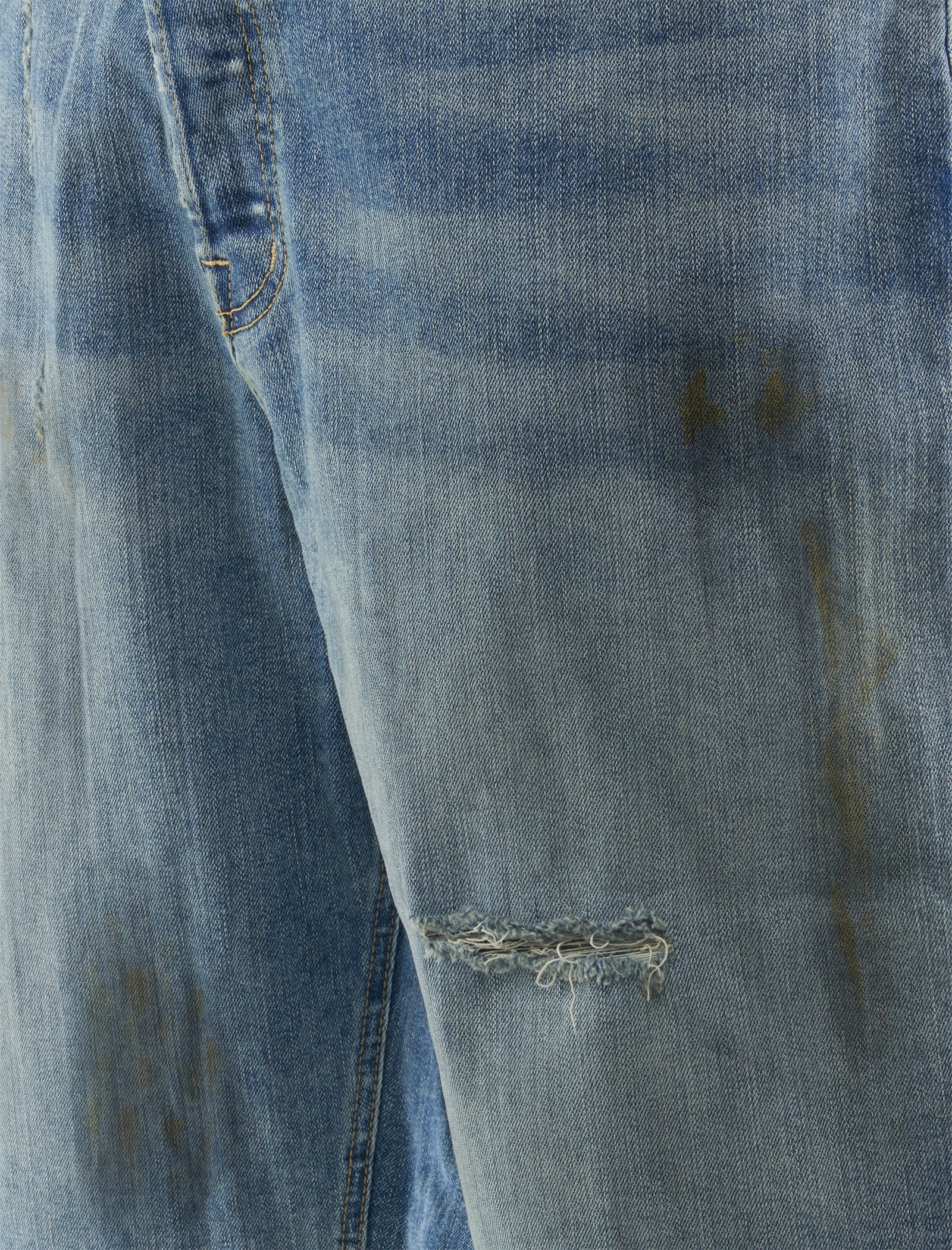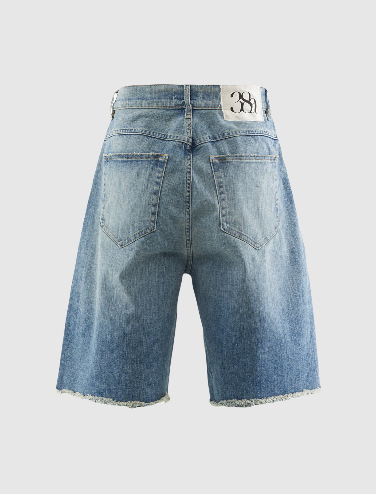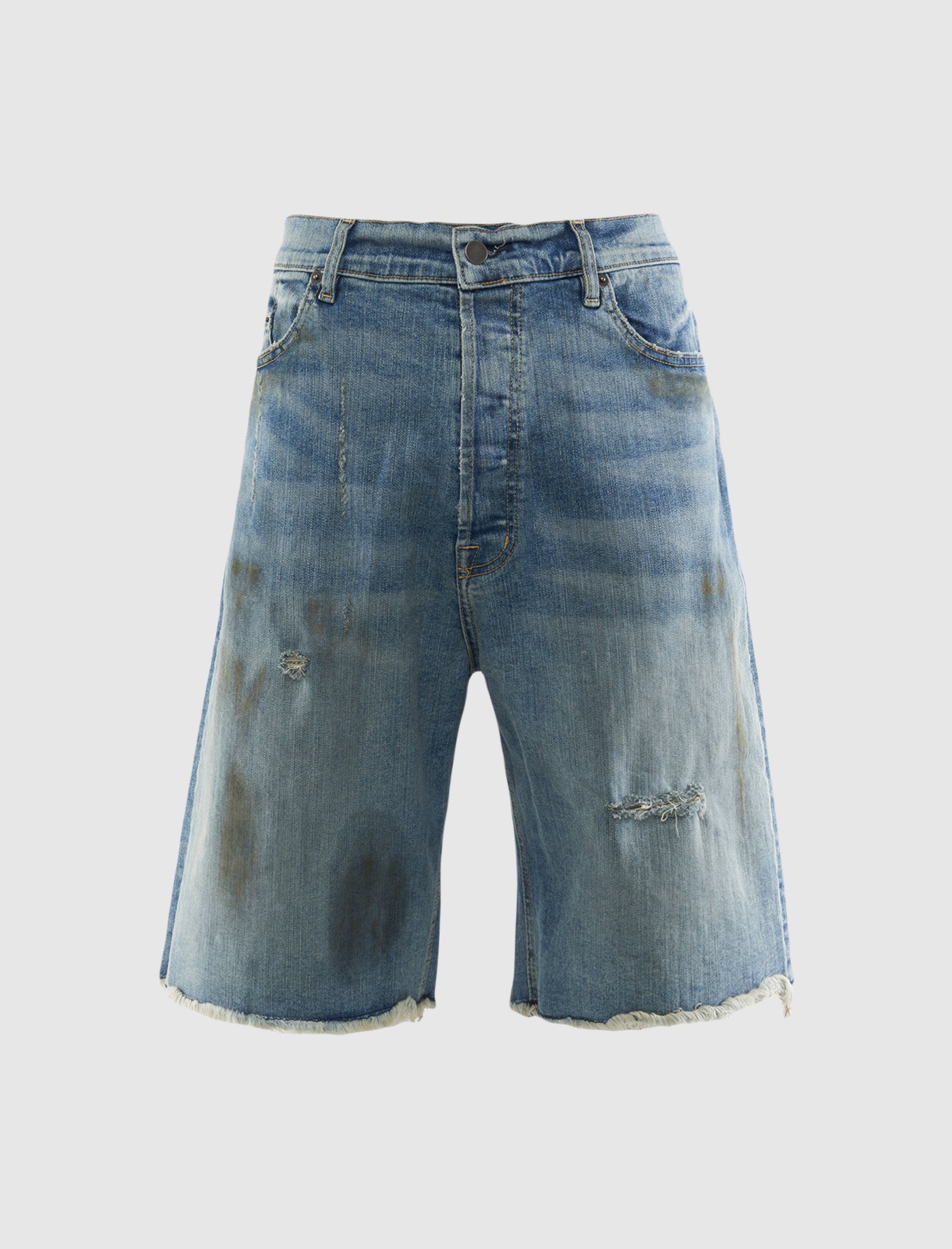 Relaxed-fit oil washed denim short. Five-pockets. Woven logo tag at back waist. Slight distressing. Raw distressed hem. Button zip closure at front.