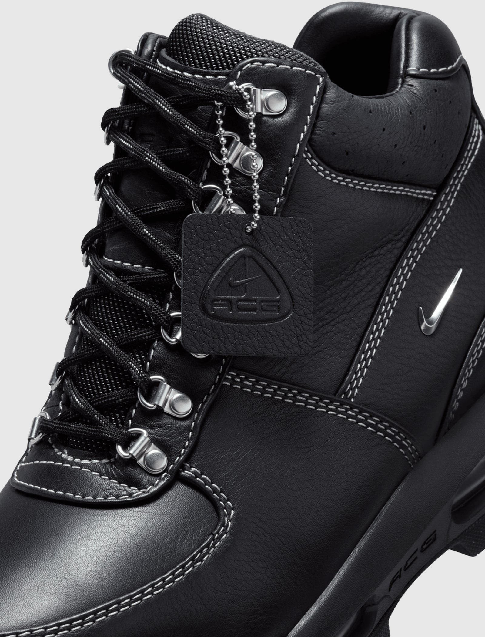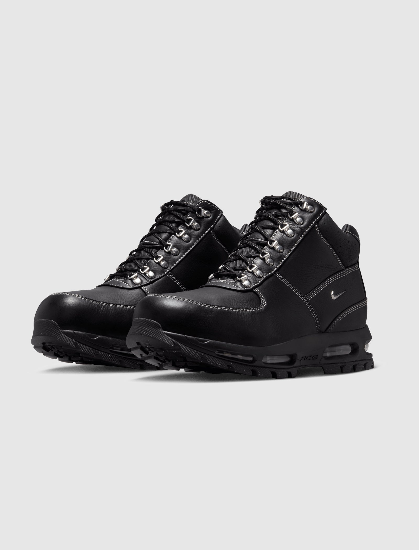 High top boots. Leather upper. Leather overlays around the toe, eyelet panels, side panels, heel counter, and collar. Front lacing with silver-tone D-ring eyelets. Padded canvas tongue. Composite foam midsole with a full-length air unit. Rubber outsole.
