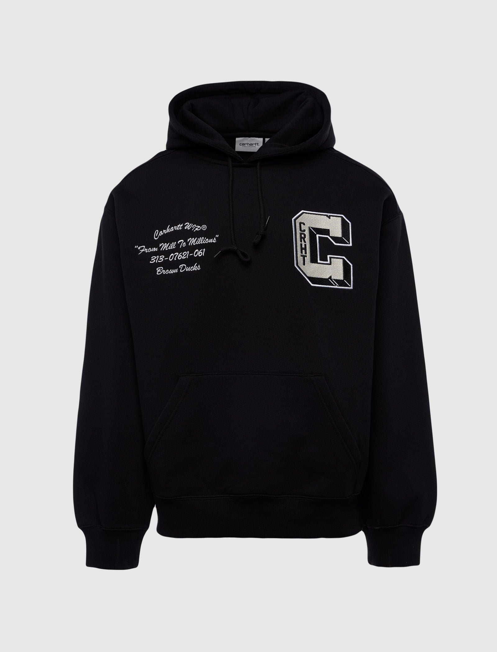 Balloon-fit heavyweight pullover hoodie. Fixed drawstring hood. Embroidered logo texts with logo patch at front. Kangaroo pocket at front. Ribbed cuffs and sleeves.