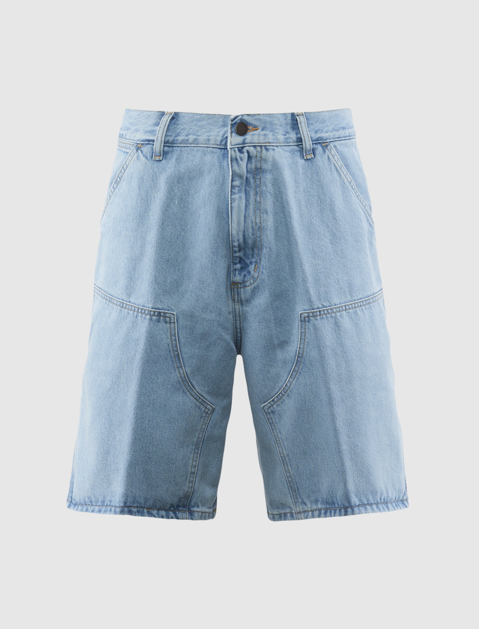 Relaxed-fit double knee denim shorts. Five-pockets. Double-layer knees. Hammer loop and patch pocket at back. Woven logo patch at back pocket. Button zip-fly closure at front.