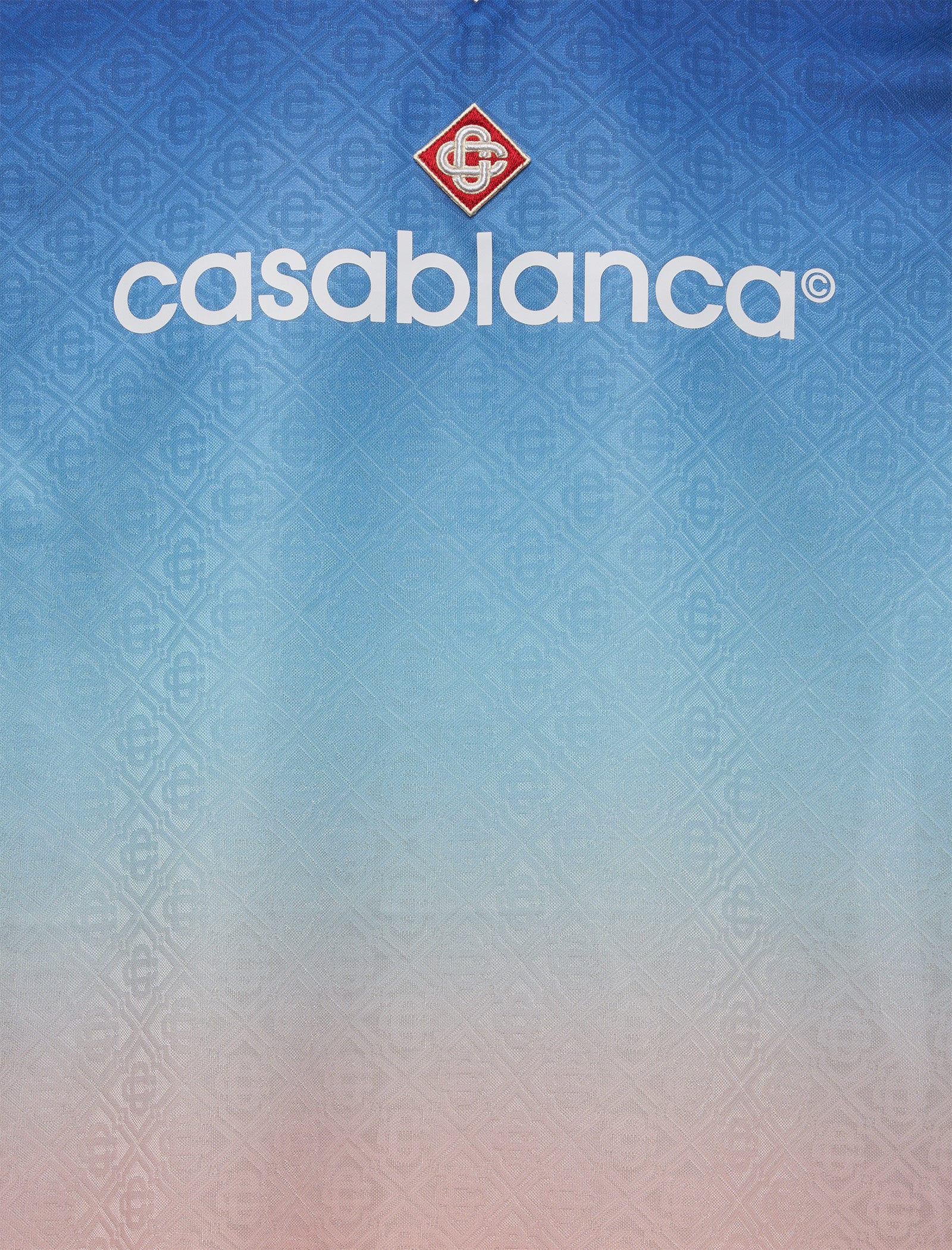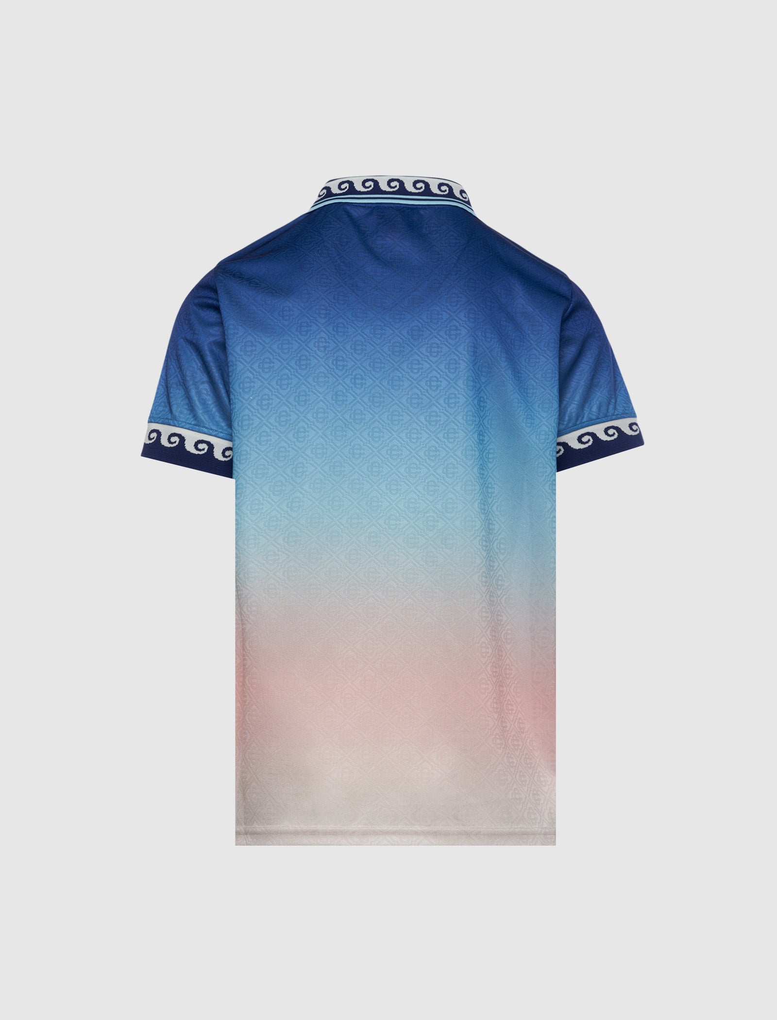 Classic-fit short sleeve gradient polyester football shirt. Contrast ribbed collar. Jacquard monogram print throughout. Graphic logo text featuring diamond logo patch at front.