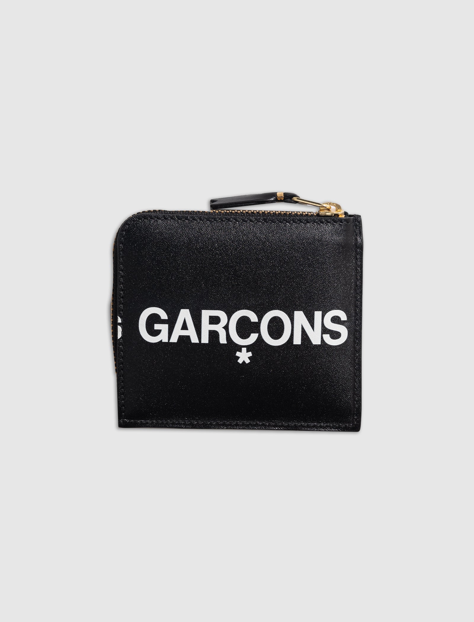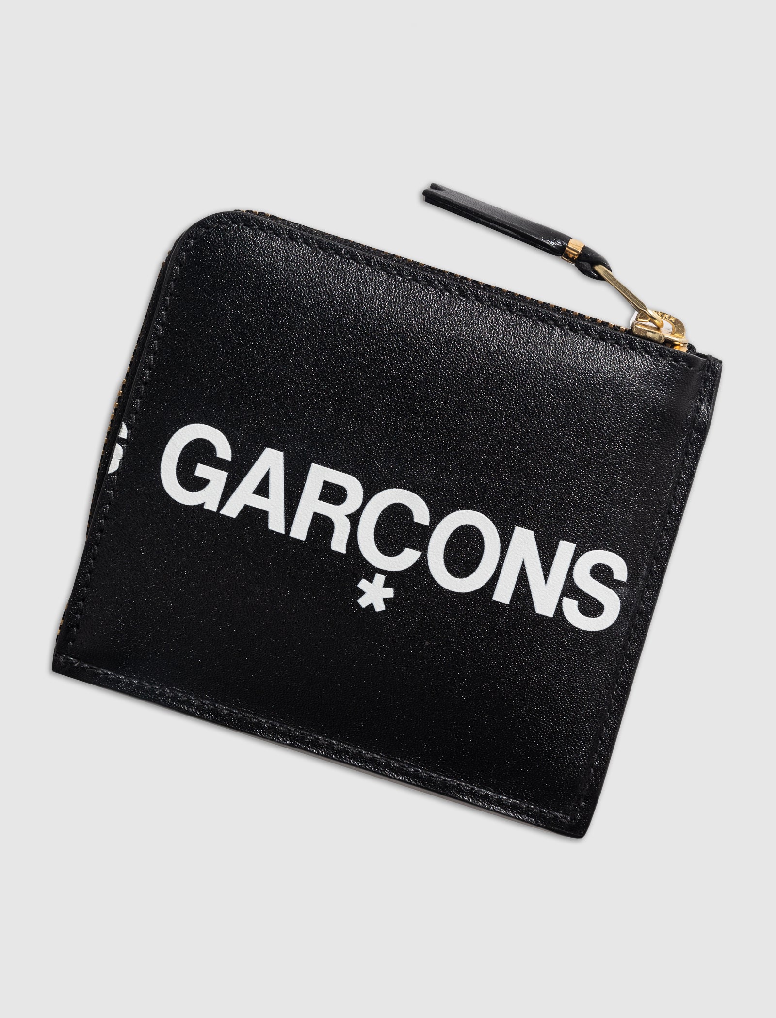 Leather wallet. Graphic logo text throughout. Pouch pocket featuring gold foil logo text at interior. Zip closure at top.