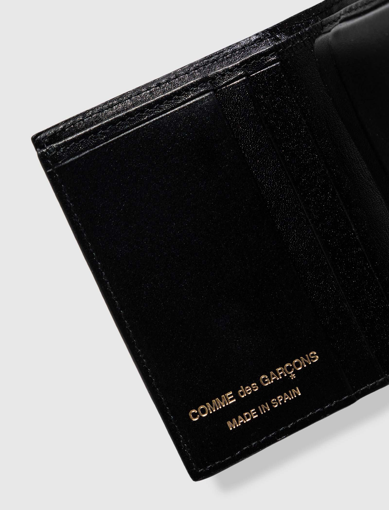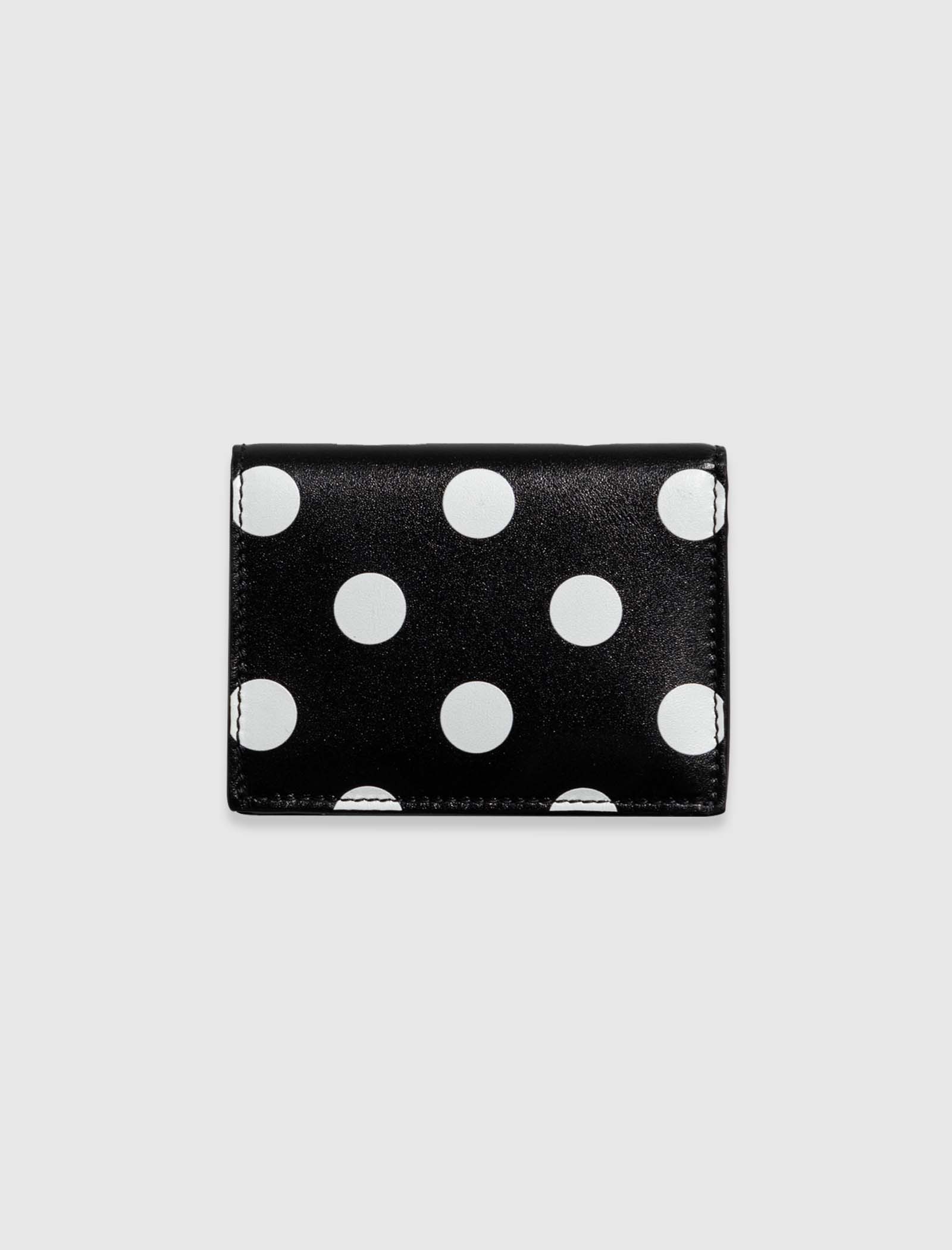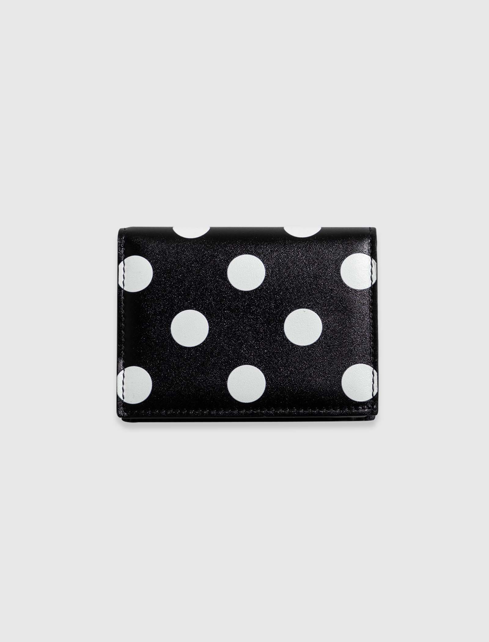 Leather bifold wallet. Polka dot pattern printed all throughout the exterior. Single bill compartment. 5 card slots. Gold foil logo printed on the bottom left.