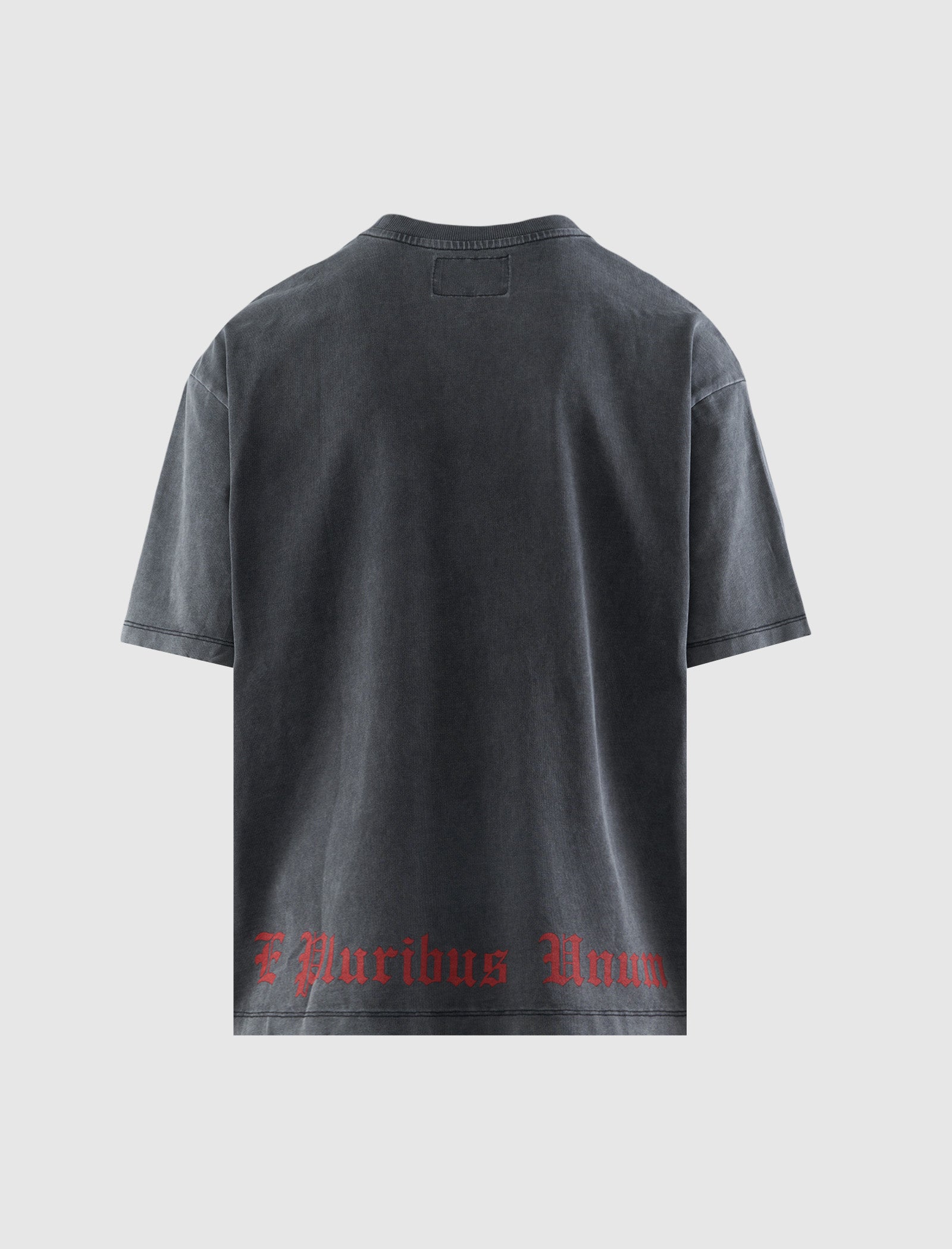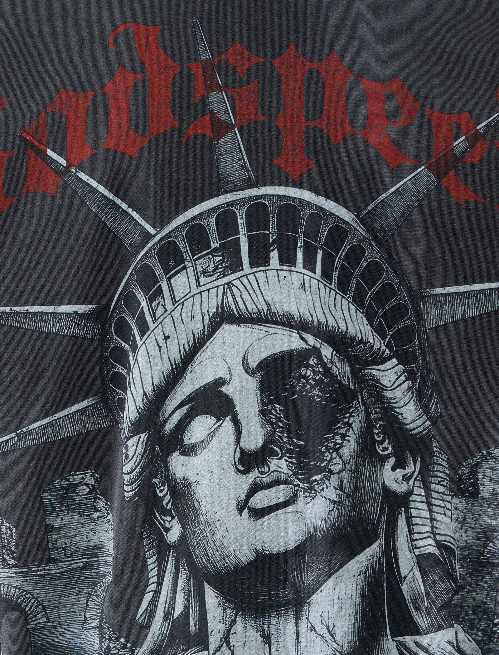 Relaxed-fit short sleeve cotton t-shirt. Crewneck. Graphic logo text and graphic print at front. Distressing throughout.
