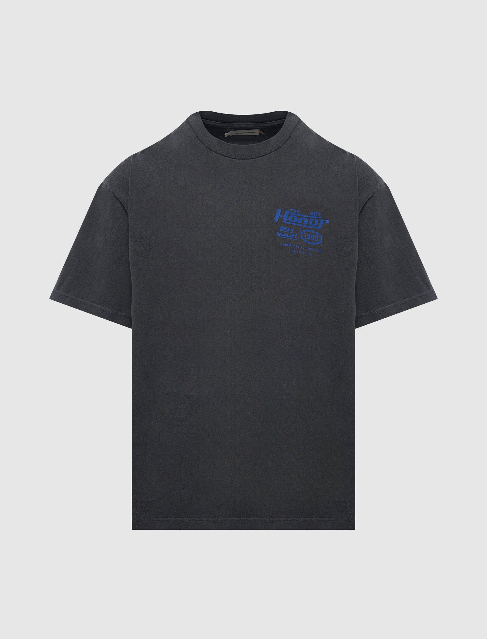Classic-fit short sleeve cotton t-shirt. Ribbed crewneck. Vintage washed. Graphic logo text with texts at front and back.