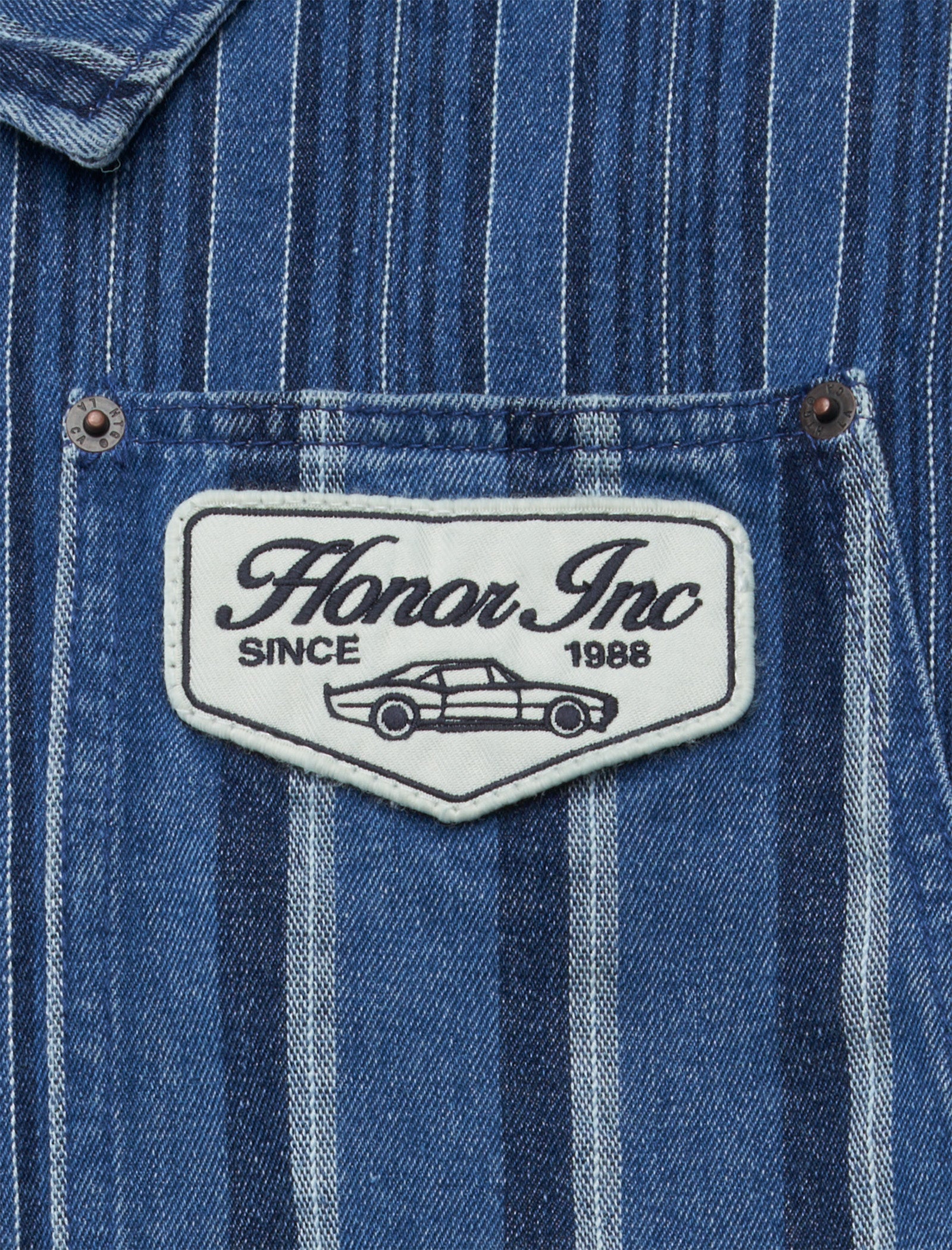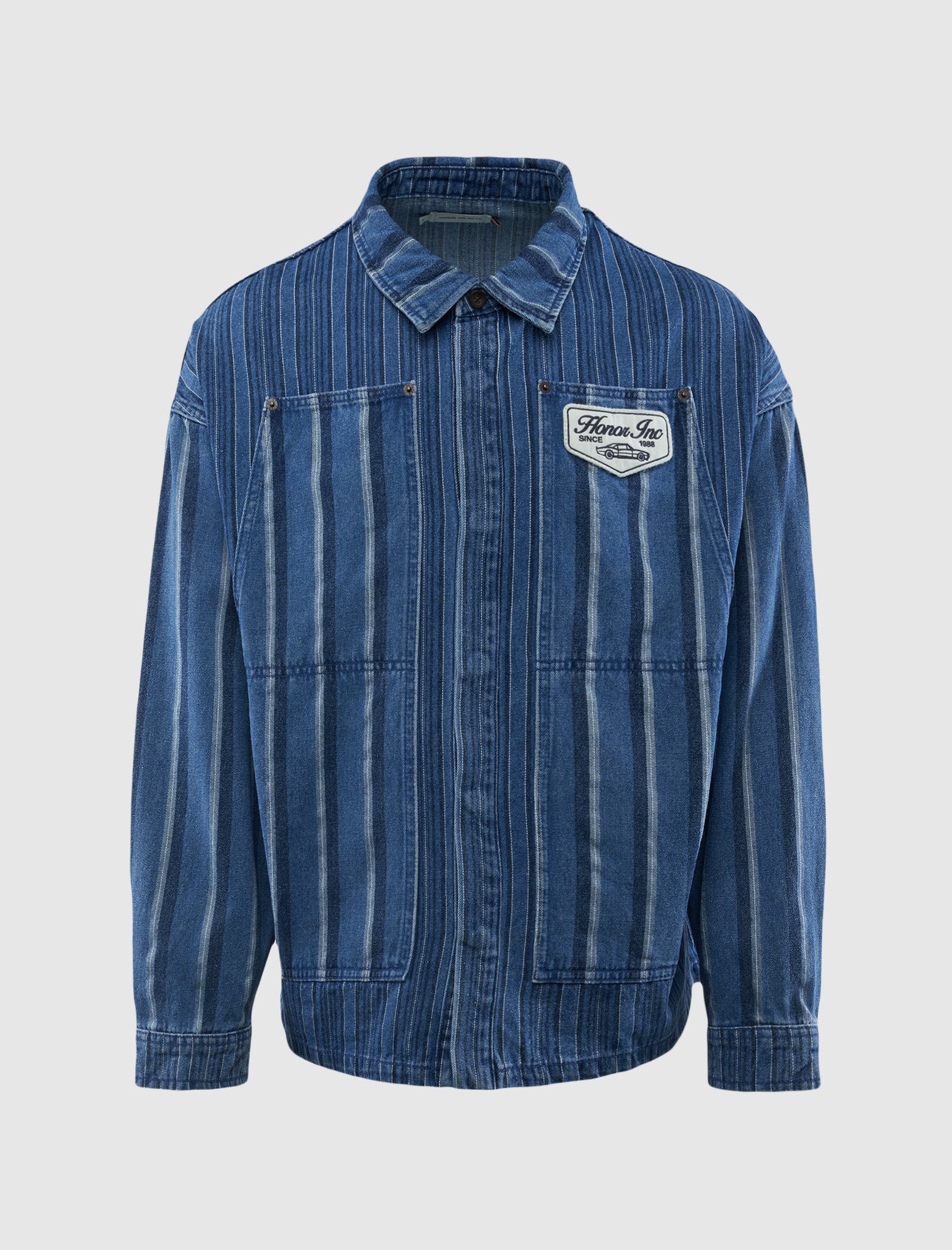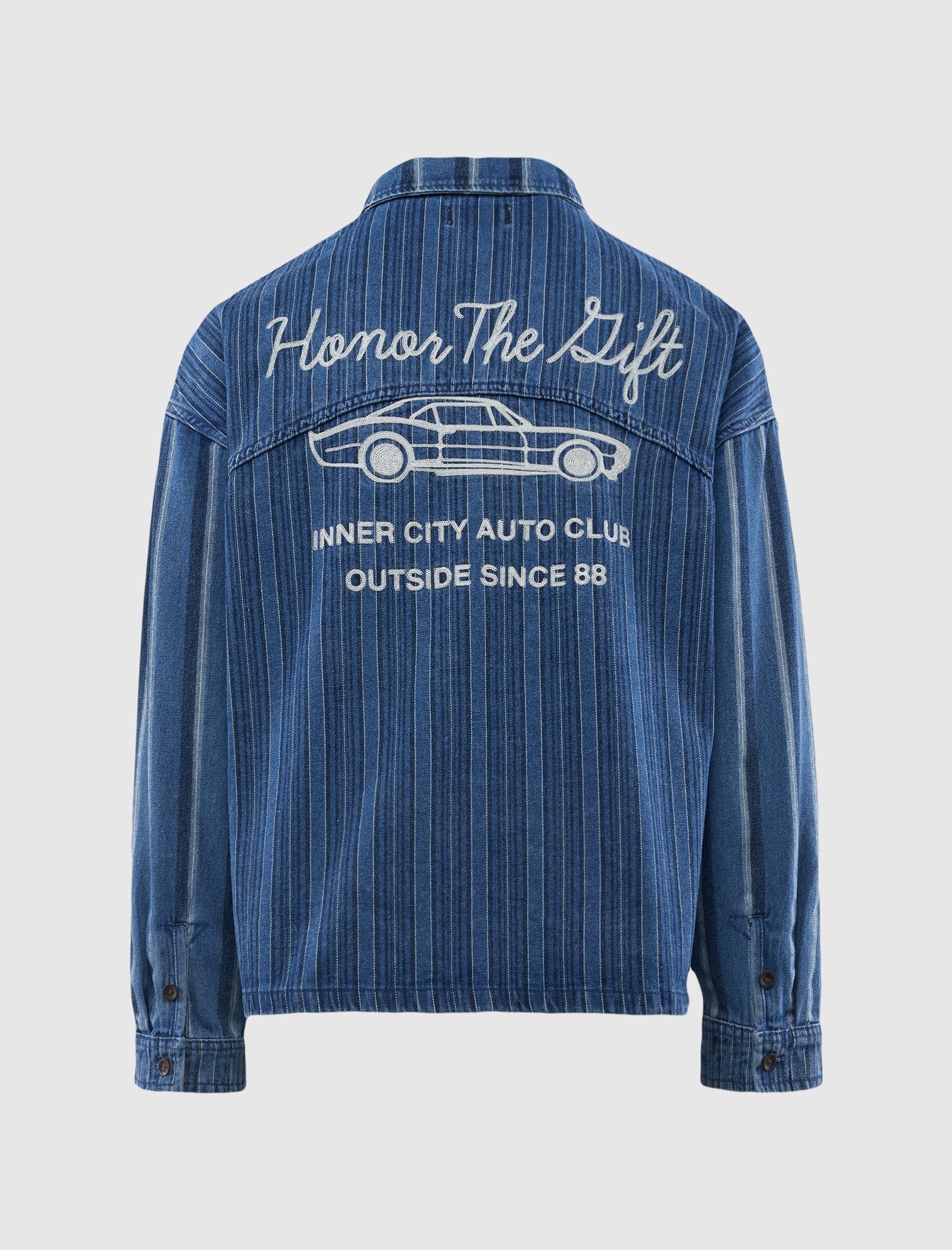 Boxy-fit novelty wash denim jacket. Classic collar. Tonal stripe print throughout. Embroidered logo patch at chest. Two-pockets on panels at sides. Graphic logo texts with car print at back. Shank button closures at center front.