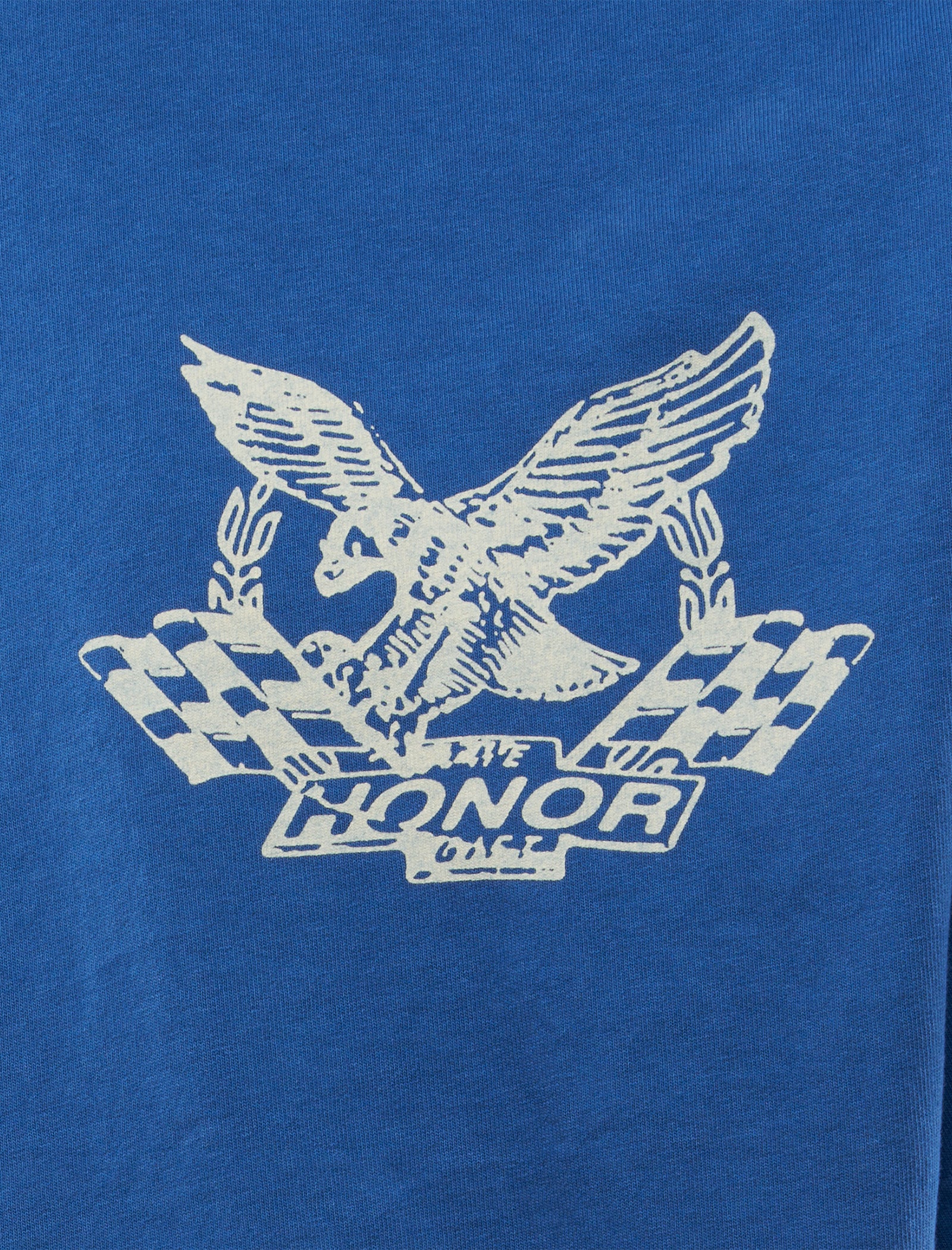 Classic-fit short sleeve cotton t-shirt. Ribbed crewneck. Graphic logo text featuring eagle print at chest. Graphic worn logo text and text at back.