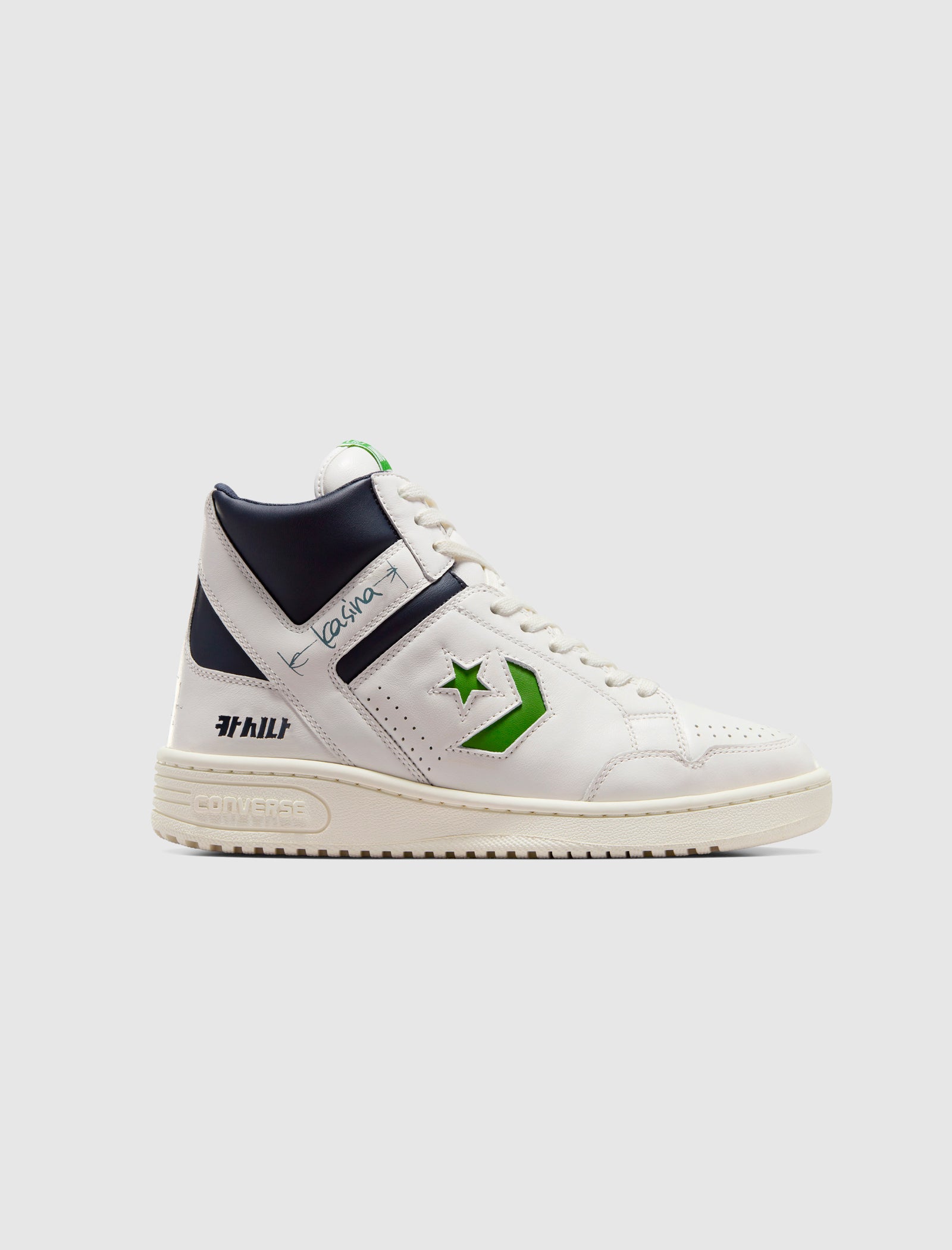 High top sneakers. Leather upper. Leather overlays around the toe, eyelets, collar, and heel counter. Padded collar. Front lacing. Perforated leather toe box and side panels. Cut-out logo on the side panels. Rubber midsole. Rubber outsole.