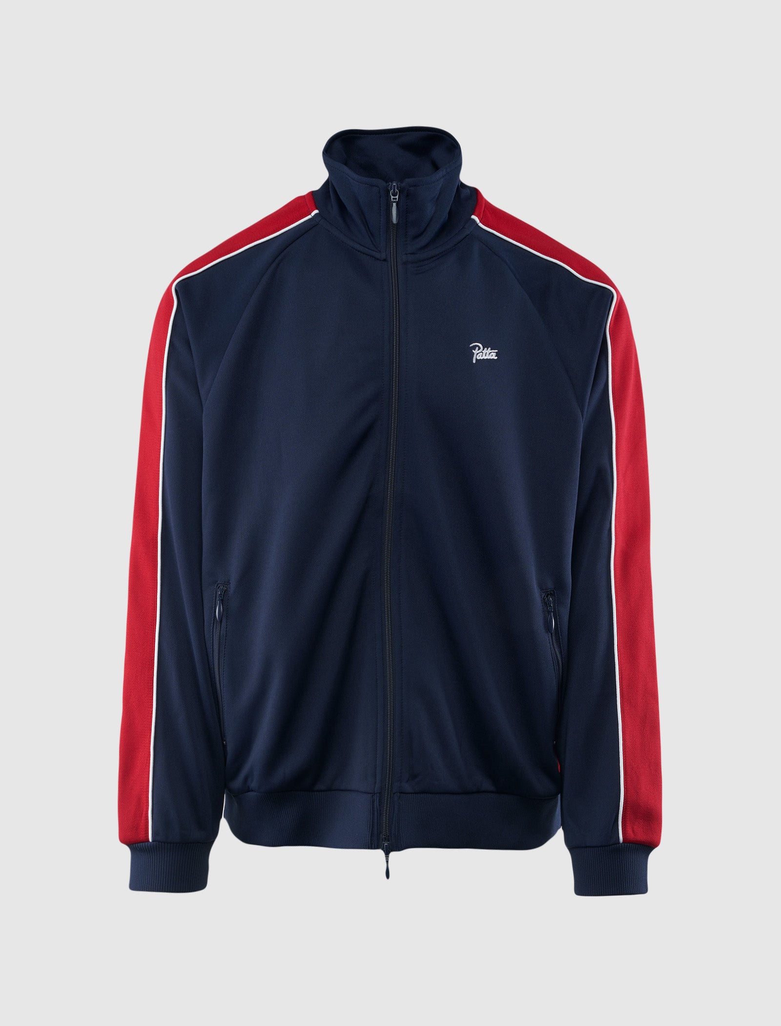 Relaxed-fit track jacket. Stand collar. Embroidered logo text at chest. Knitted contrast piping at sleeves and sides. Ribbed cuffs and hem. Zip closure at center front.