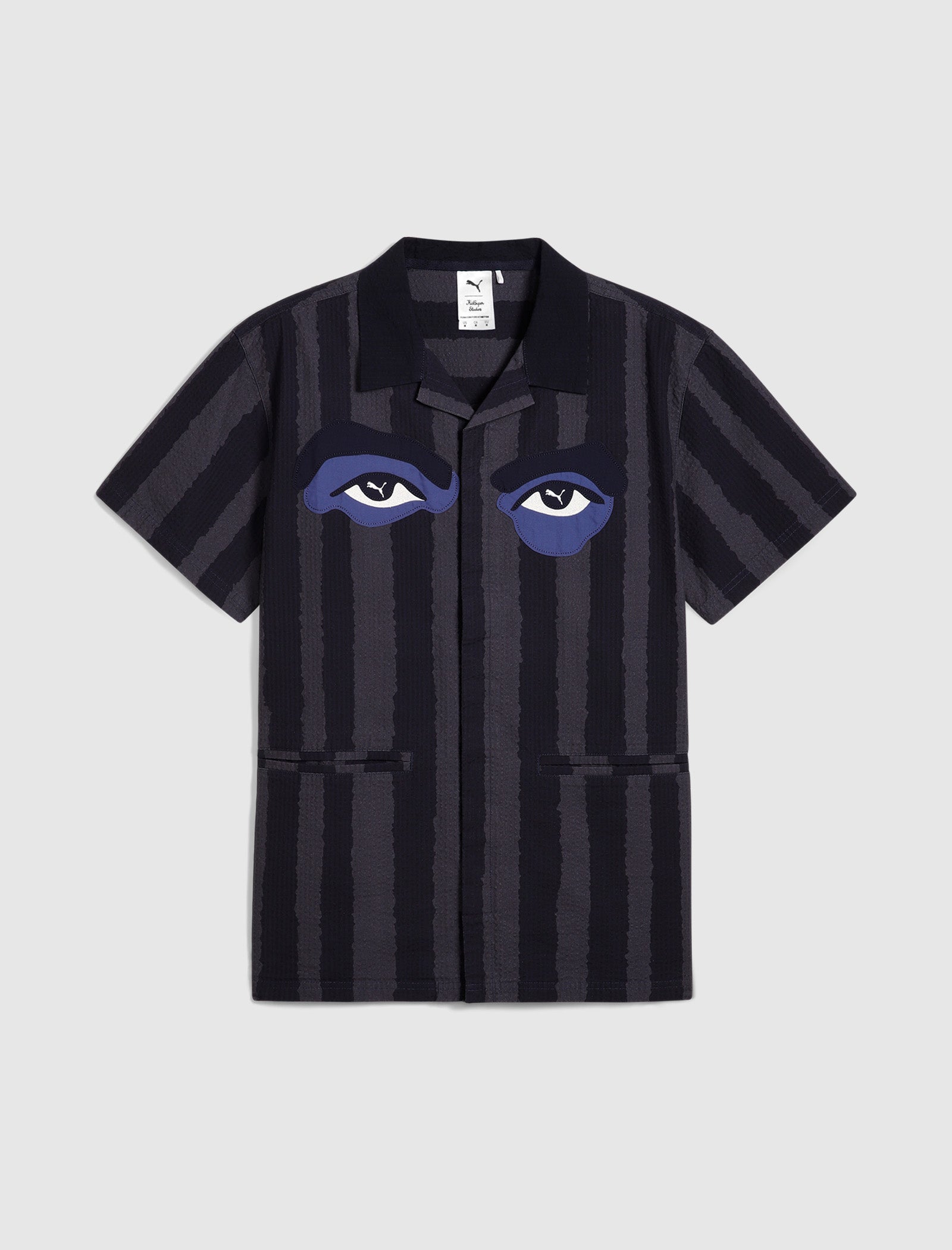 Regular-fit short sleeve shirt. Camp collar. Graphic eyes at chest. Two pockets at sides. Embroidered logo text at back. Stripes throughout. Button closures at front.
