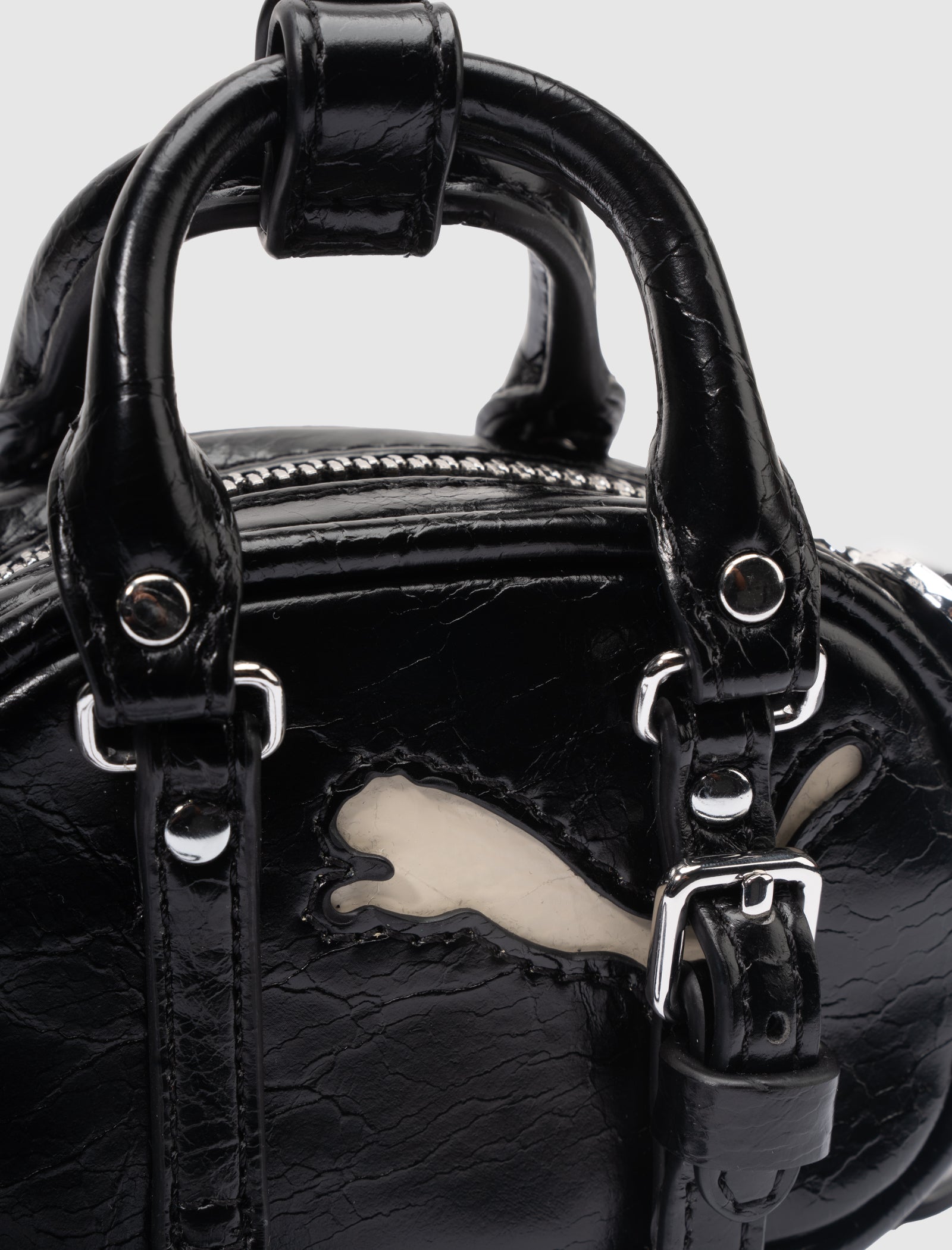 Polyester mini bag. 2 top handles with button closure. Detachable crossbody strap and twist ring closure. Engraved logo print at front. Graphic logo text at back. Silver-tone metal logo coin zipper pull at top.