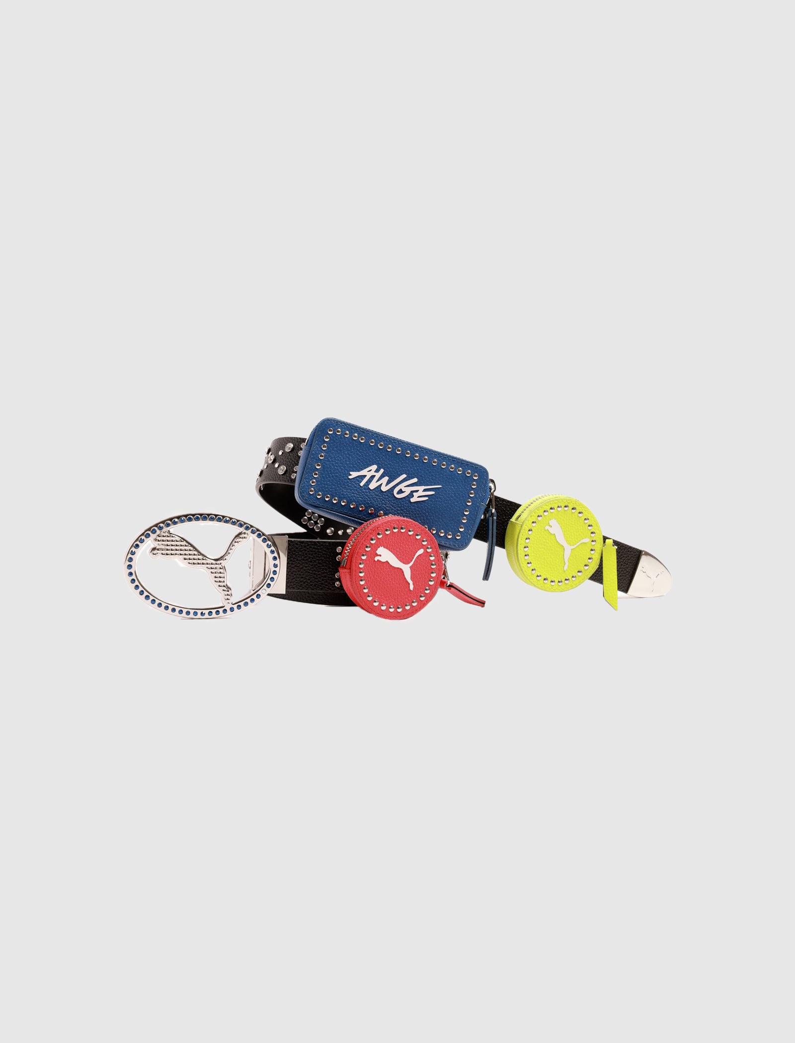 Leather belt. Two exchangeable buckles. Three detachable belt pouches with zip closures. Metal rivet details on belt and pouches.