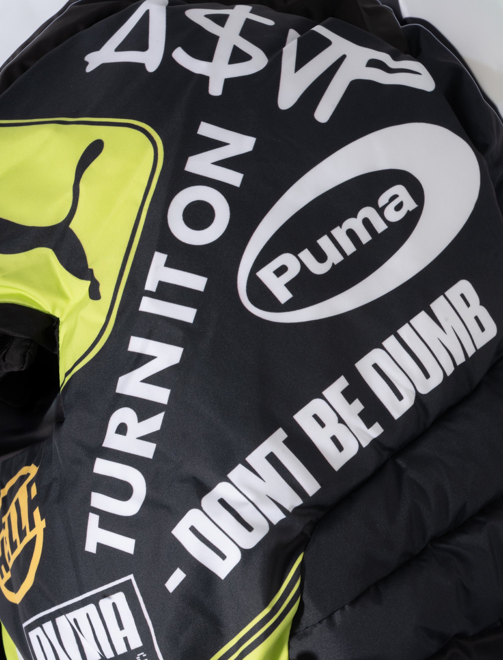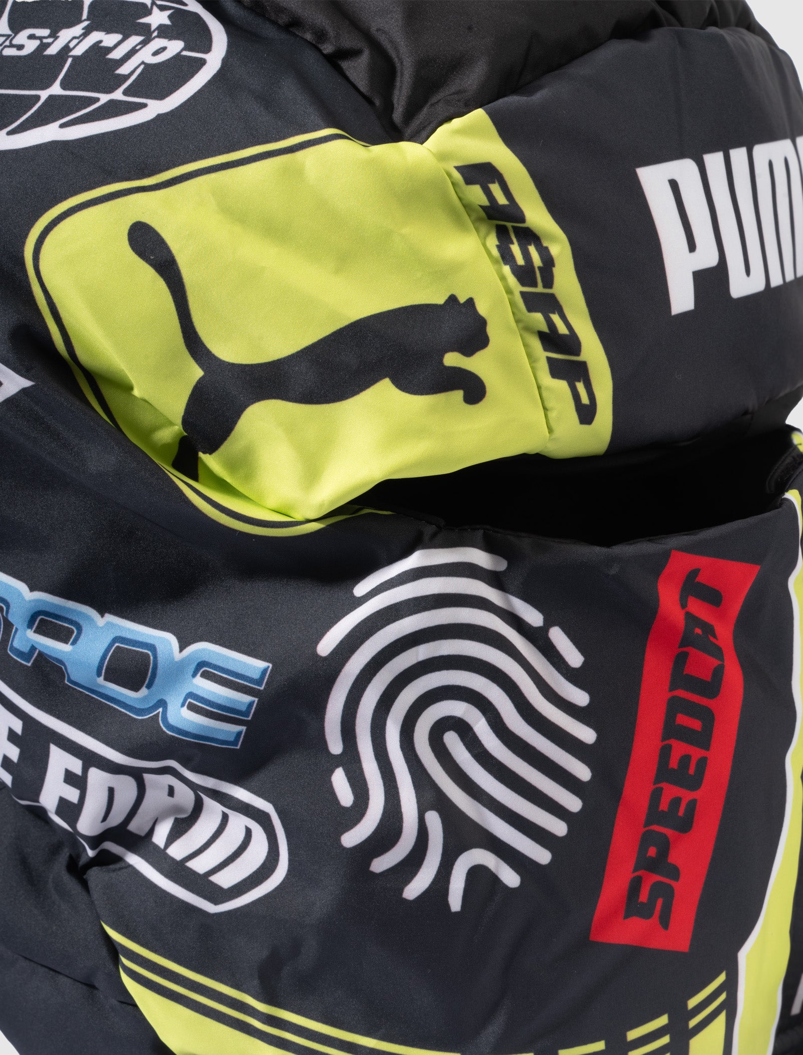 Padded balaclava. Opening on the front for visibility. Graphic logo prints and text throughout. Elastic pulls at sides and back.