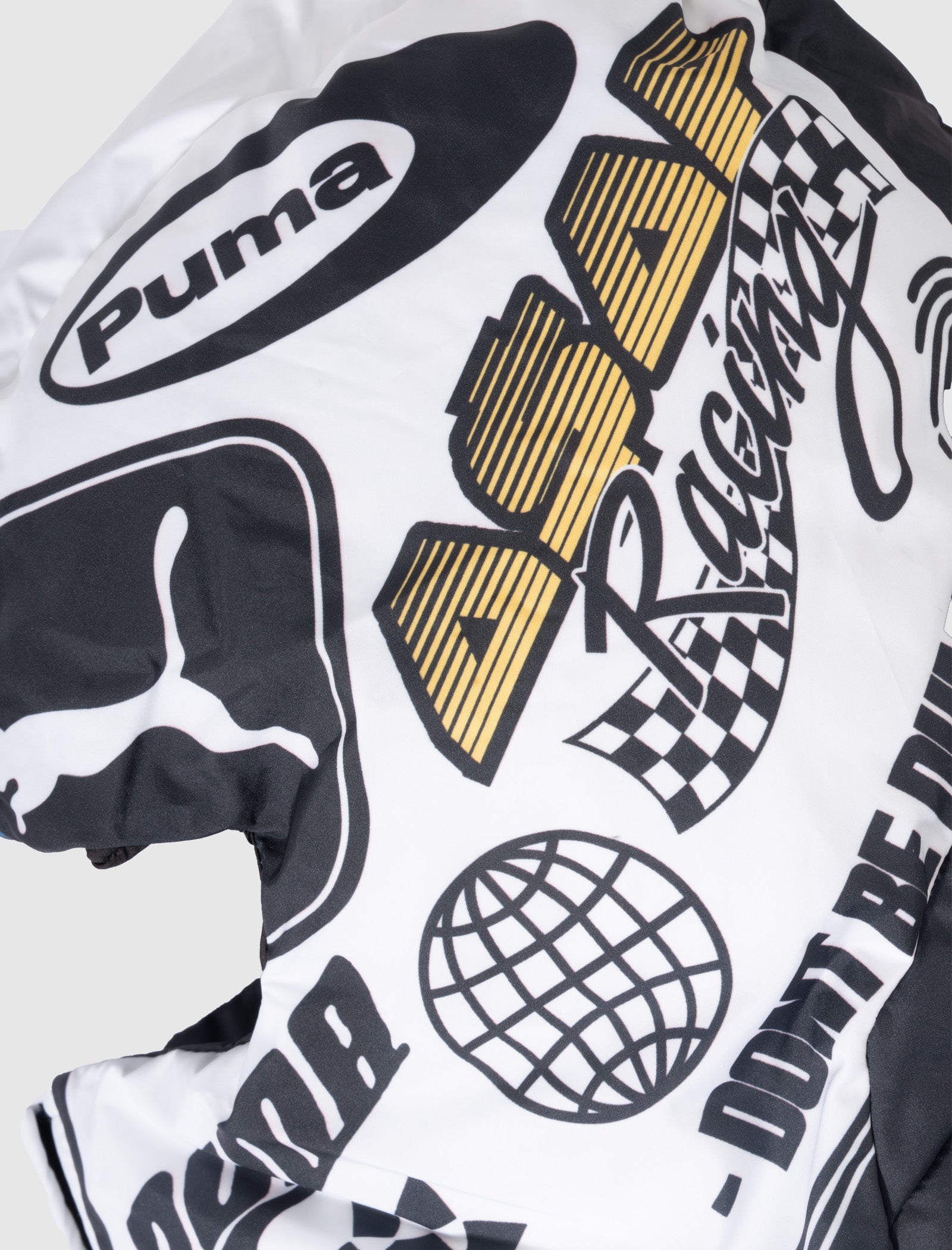Padded balaclava. Opening on the front for visibility. Graphic logo prints and text throughout. Elastic pulls at sides and back.