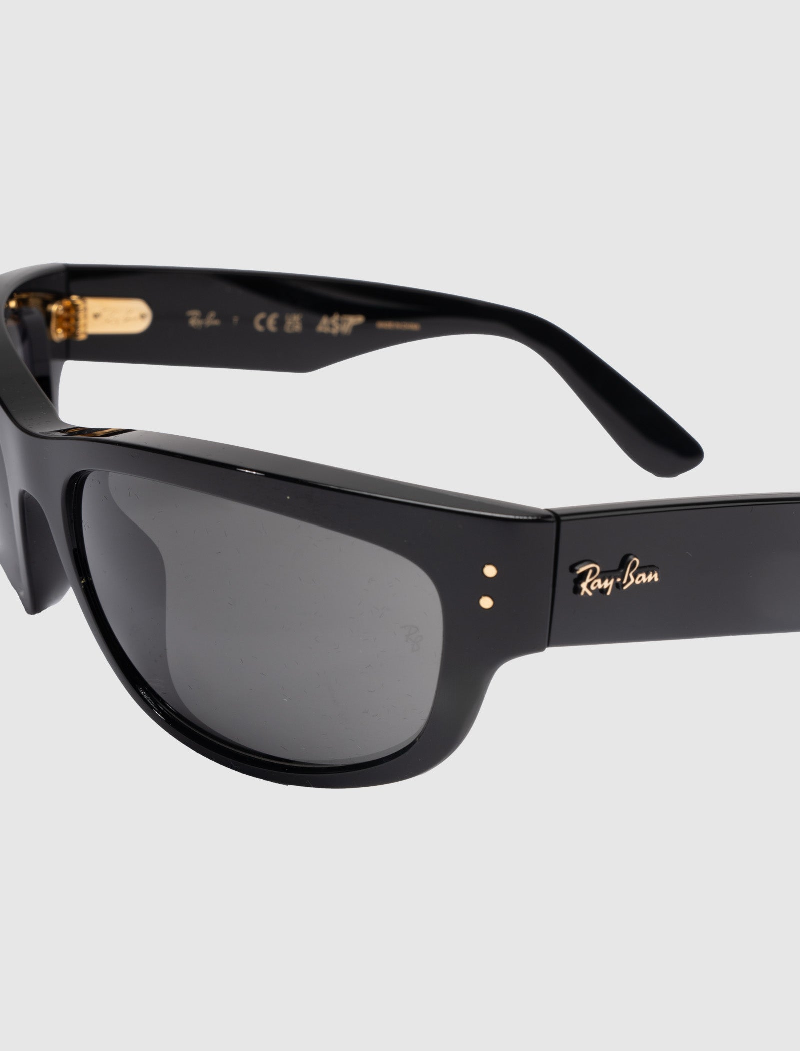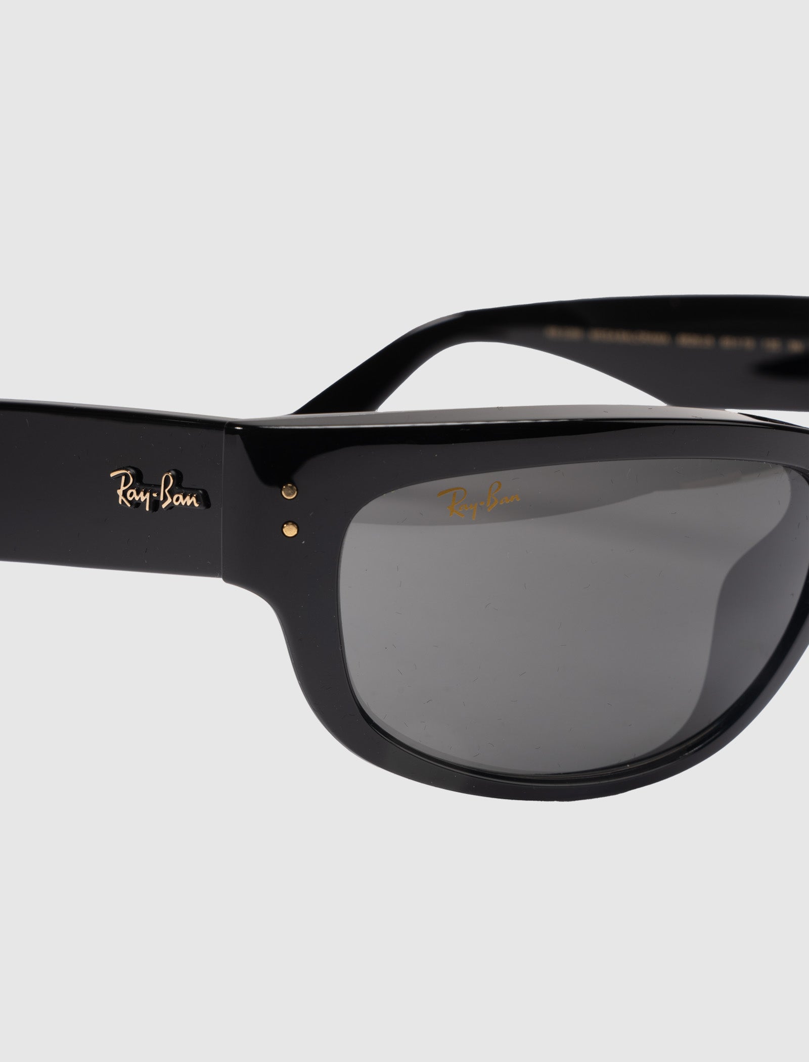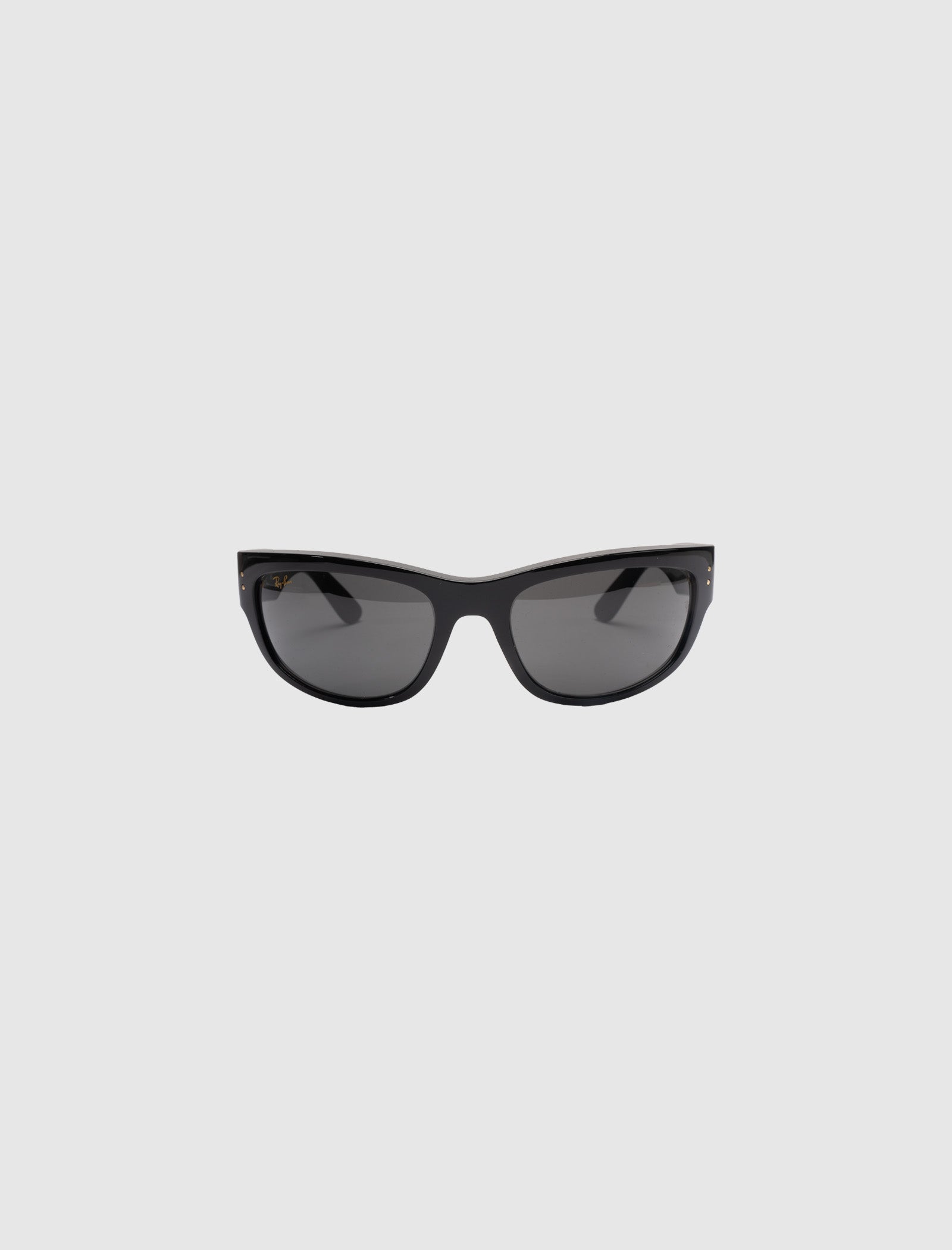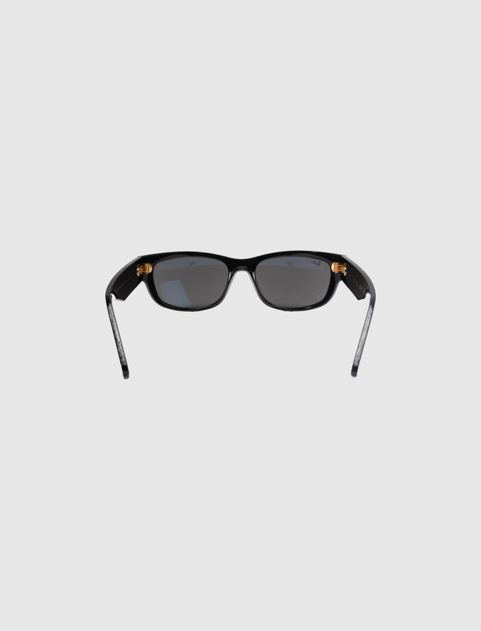 High bridge fit wraparound frame sunglasses. Tinted UVA/UVB protected. Anti-reflected and anti-scratch. Thick tapered arms with a single hinge on each side. Gold tone engraved text and hardware. Graphic text at front.