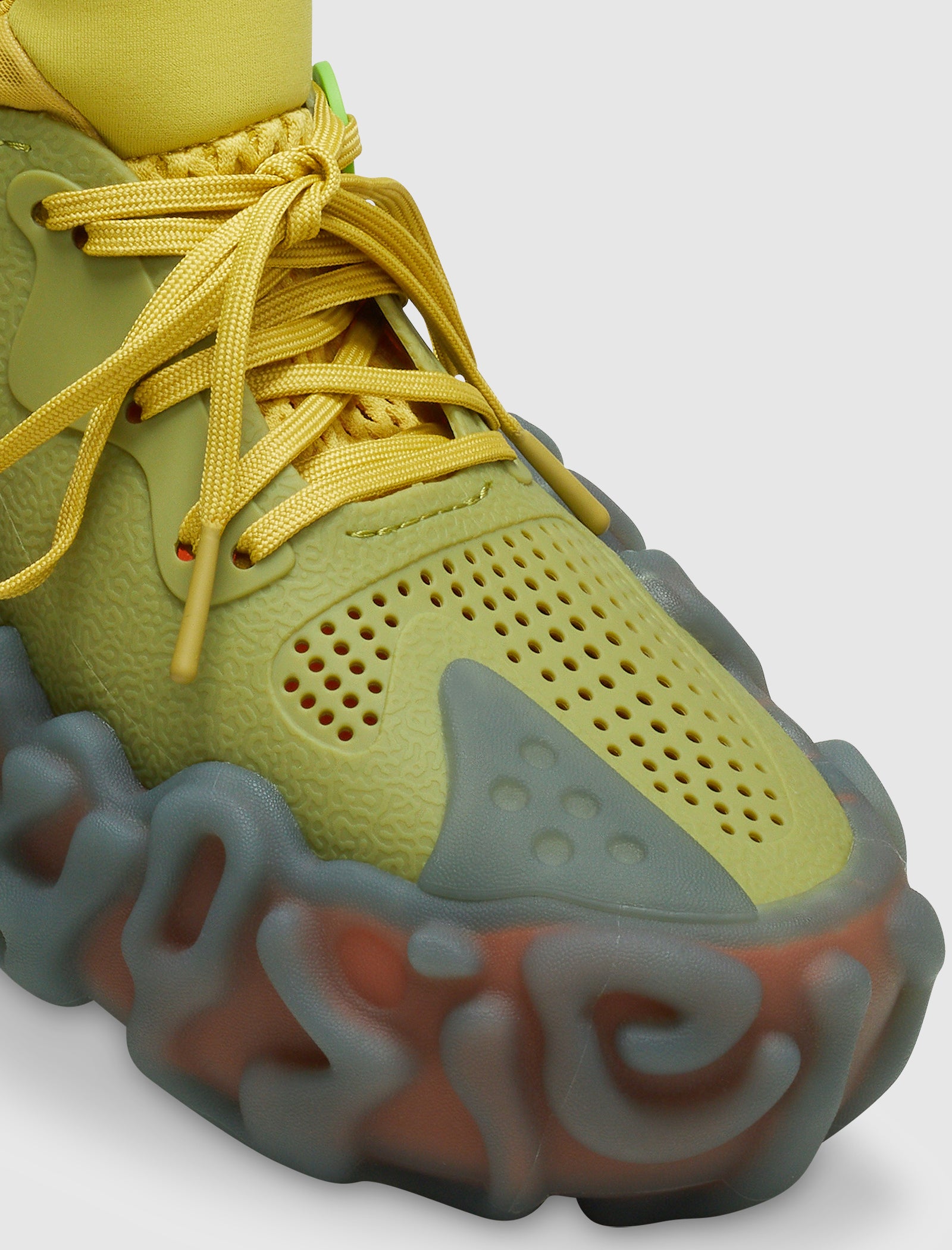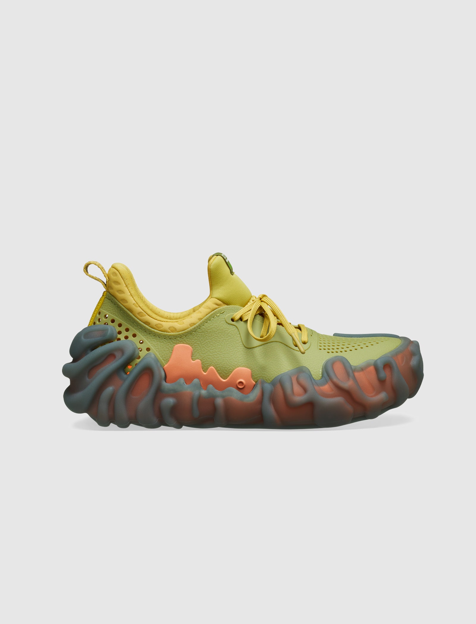Low top sneakers. Croslite upper with perforations at the toe box, and heel counter. Front lacing. Padded one-piece foot insert. Textured chunky rubber outsole.