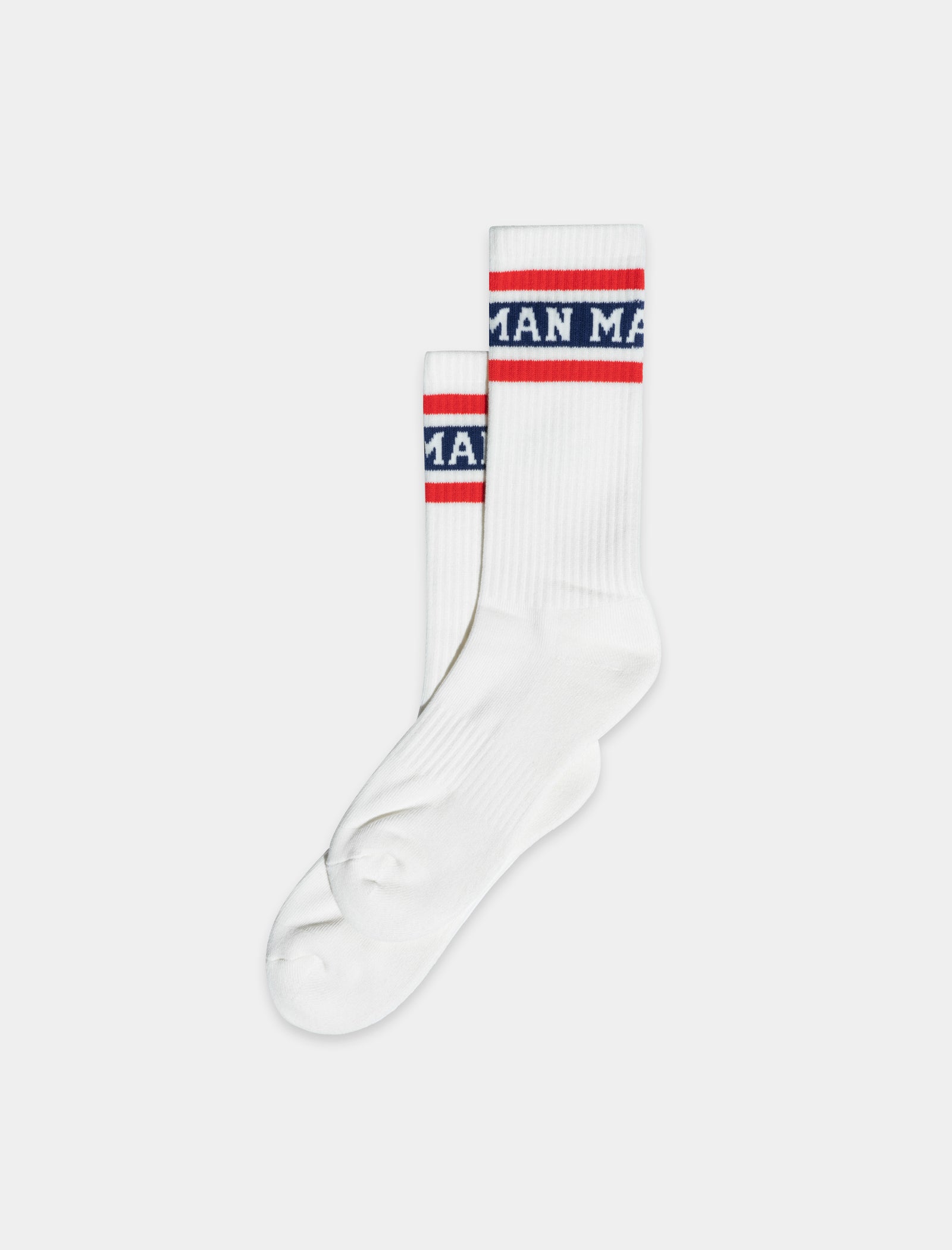 Ribbed knit socks. Jacquard striped logo at the collar. Calf-length.