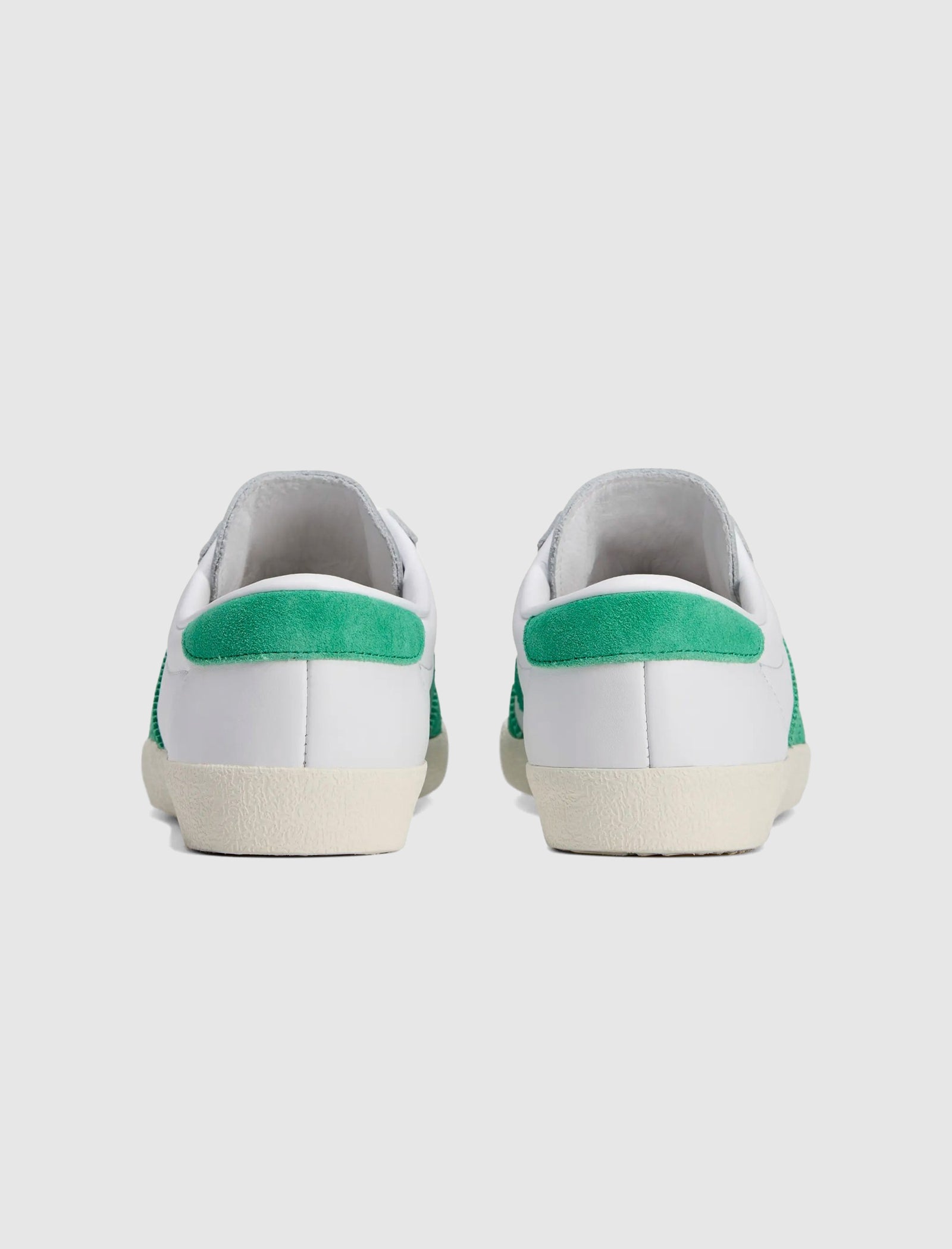 Low top sneakers. Leather upper. Leather overlays on the toe, and eyelet panels. Suede stripe motif patches stitched on the side panels. Padded collar. Suede overlay on the back of the collar. Leather tongue with a stamped logo at the center. Front lacing. Rubber midsole. Rubber outsole.