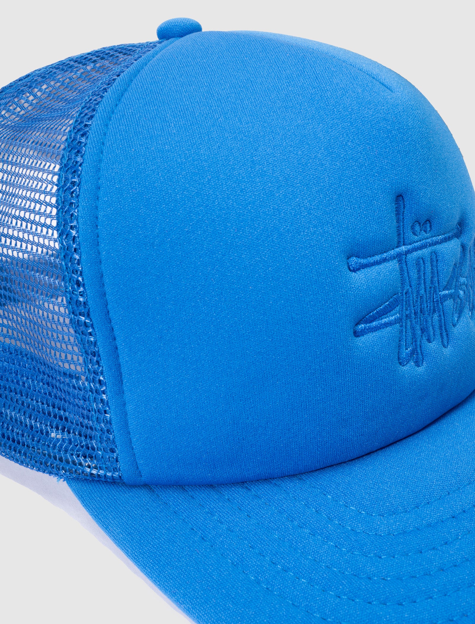 Trucker hat. Curved brim. Embroidered logo text at front. Mesh panels. Logo tag at back. Adjustable snap closure at back.