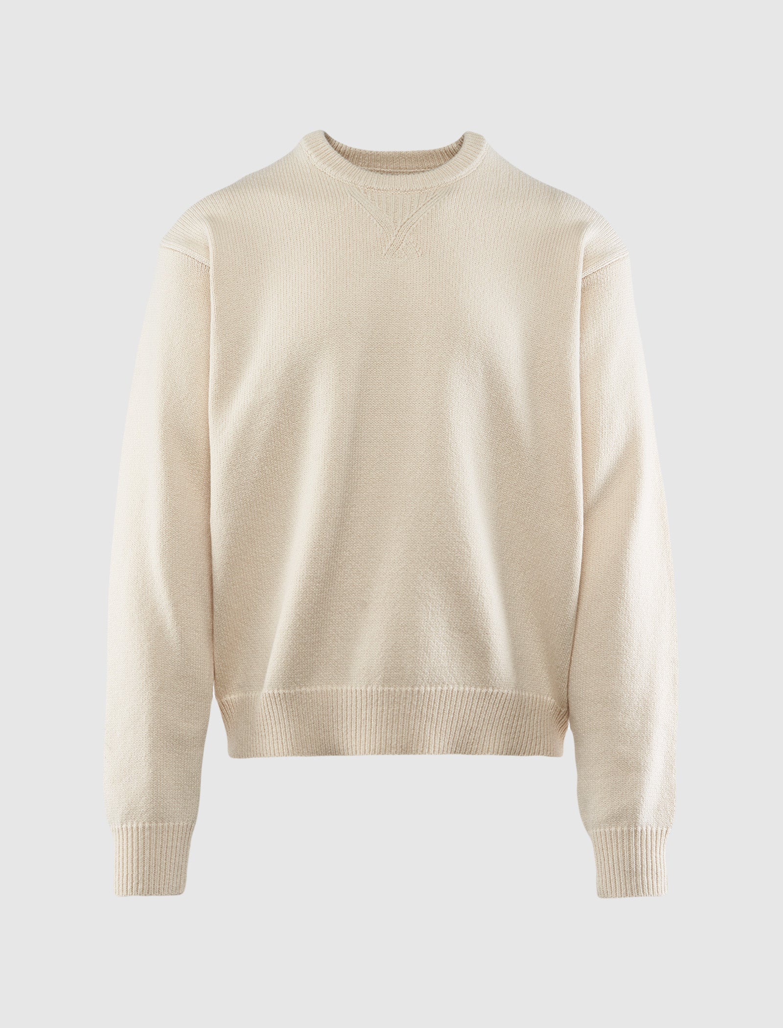 Relaxed-fit wool blend knit sweater. Double ribbed crewneck with v-stitch. Graphic logo text with number at back. Ribbed cuffs and hem.