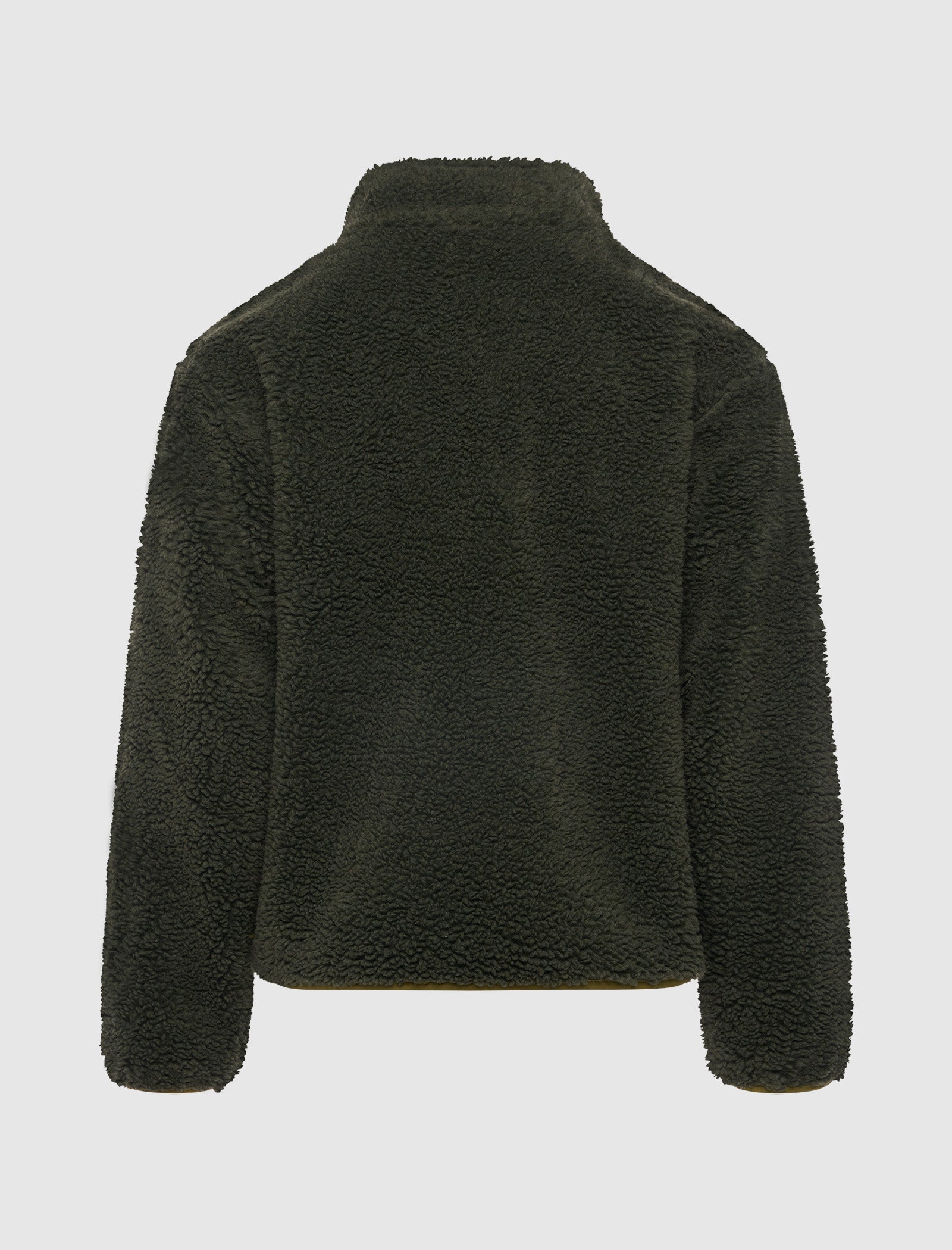 Regular-fit reversible sherpa jacket. High collar. Oversized zip pocket featuring embroidered logo text at chest. Two pockets at sides. Zip closure at center front.