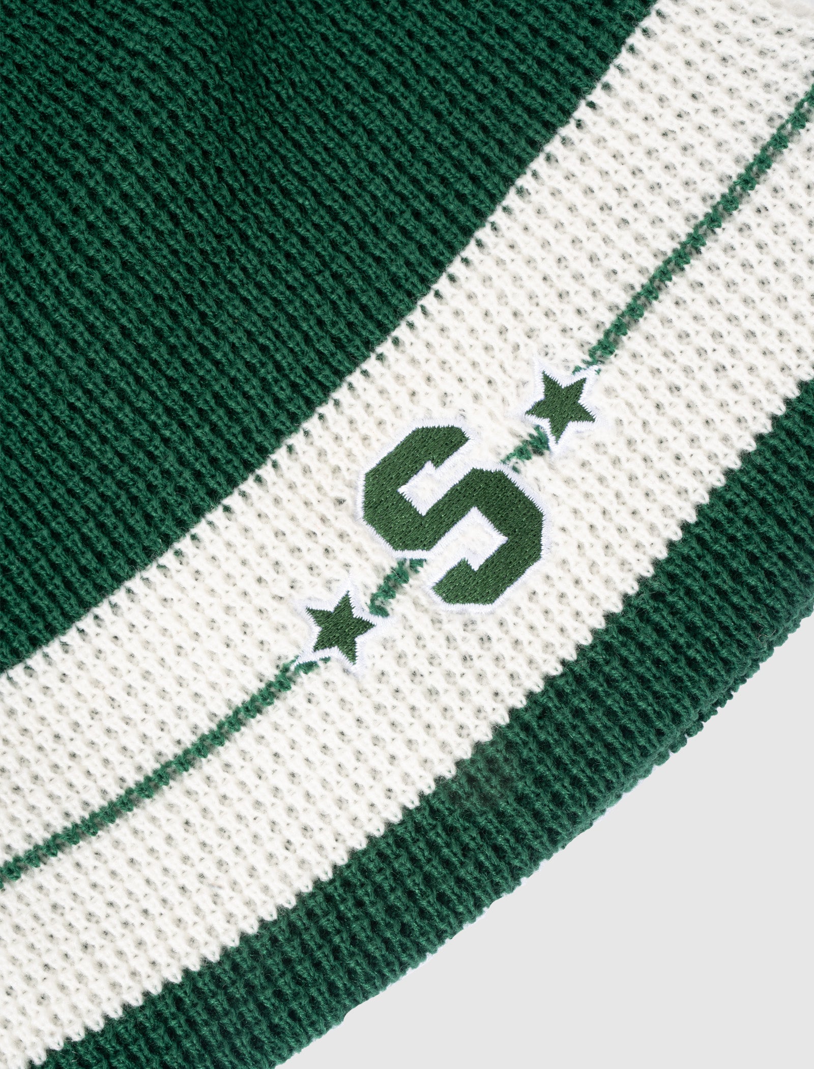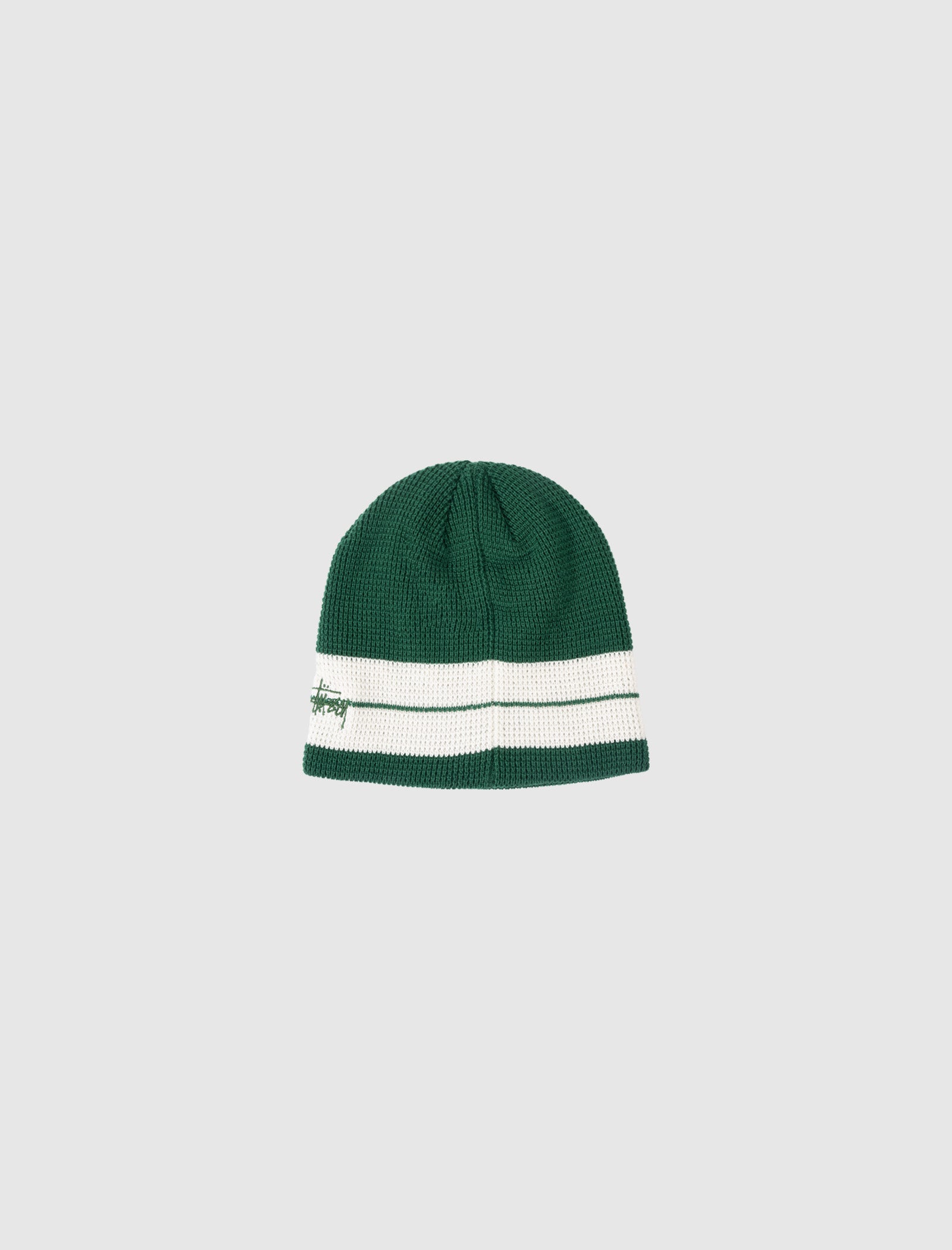 Knit beanie. Two stripes at front. Embroidered patches and logo text at front.