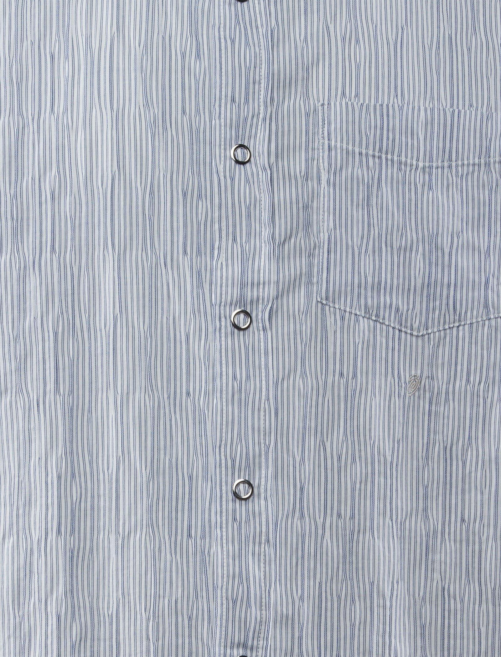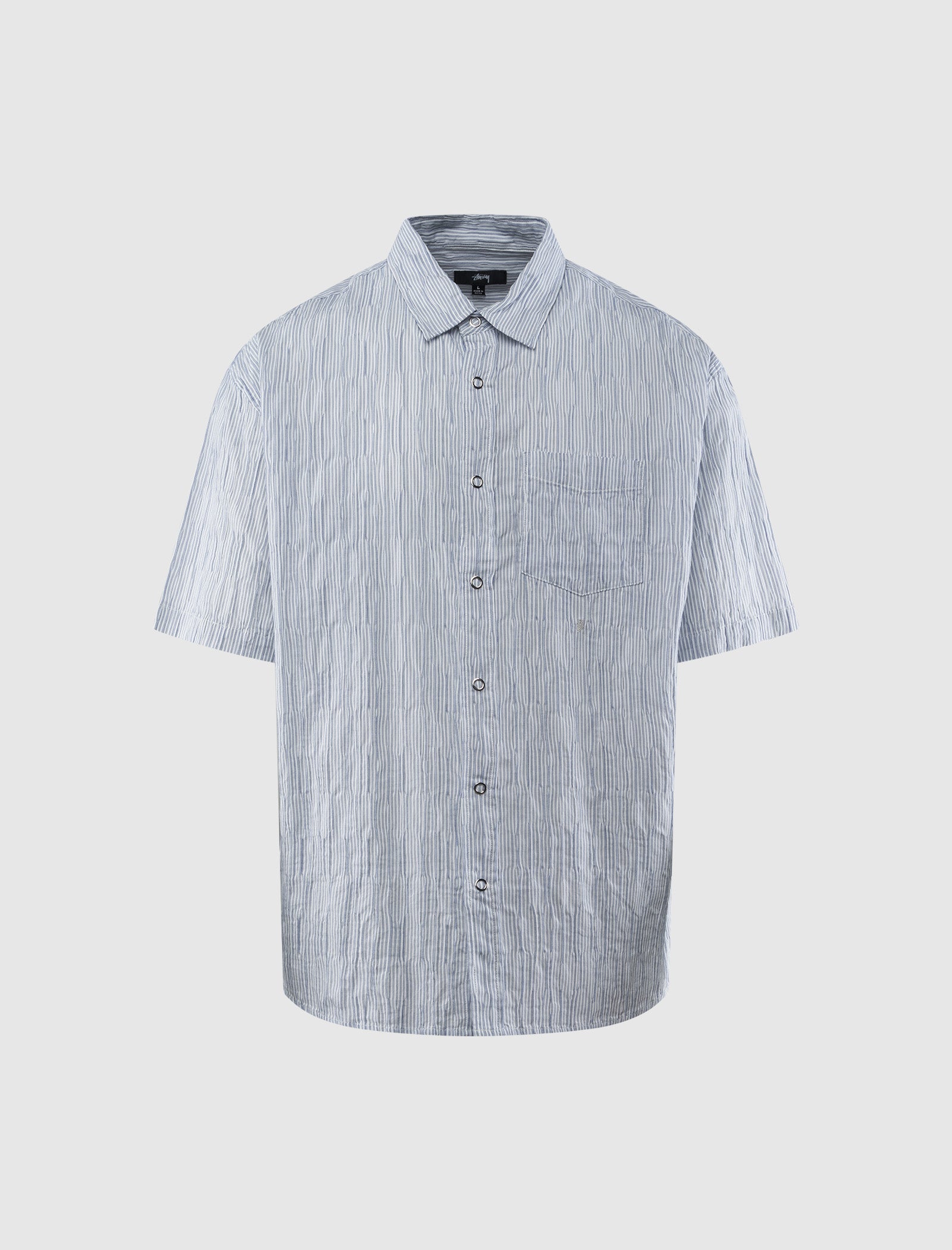 Relaxed-fit short sleeve shirt. Classic collar. Single pocket at chest. Stripes throughout. Snap closures at center front.