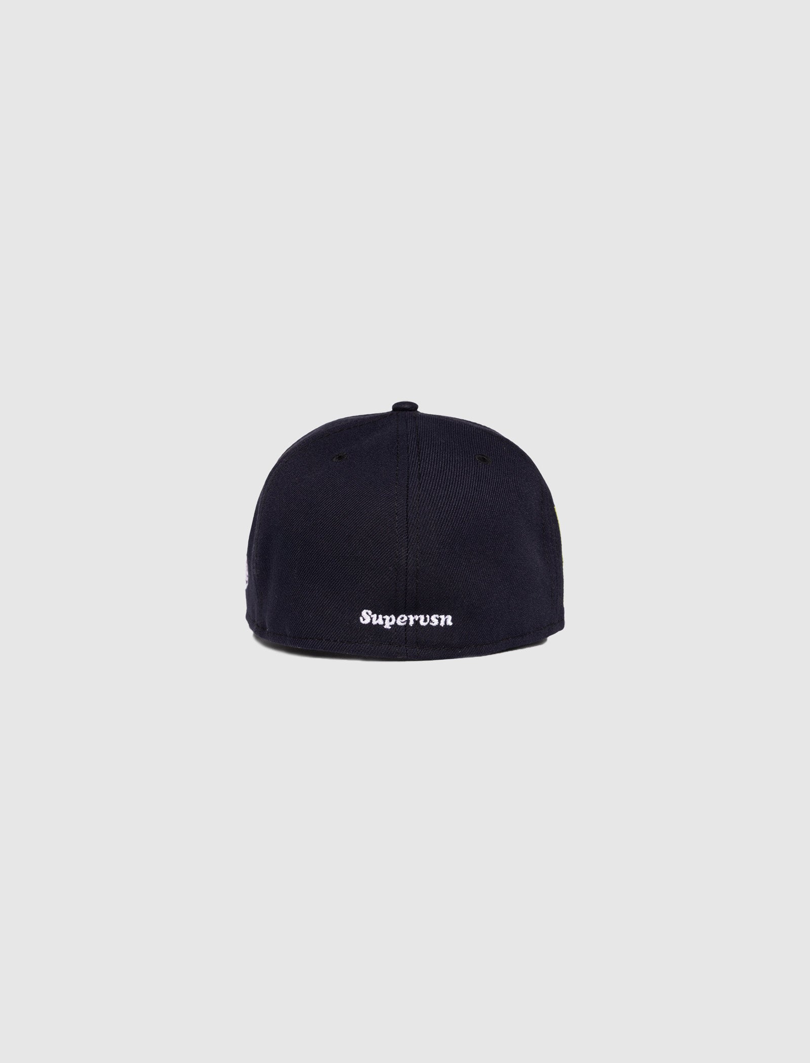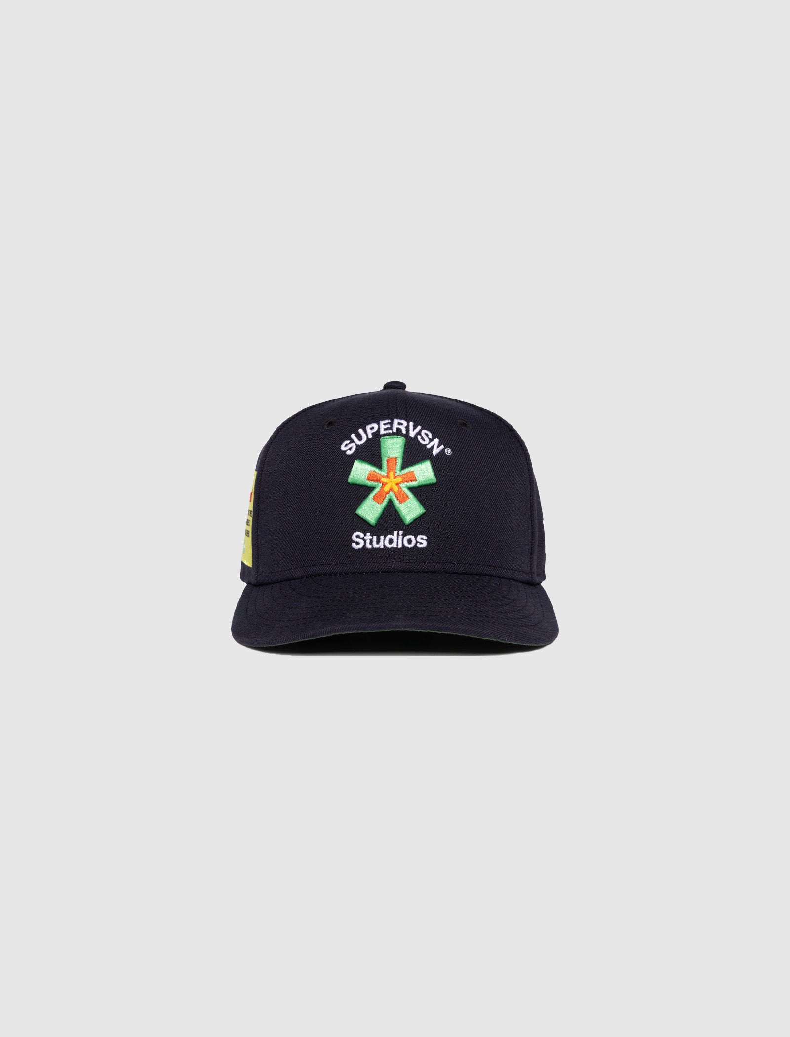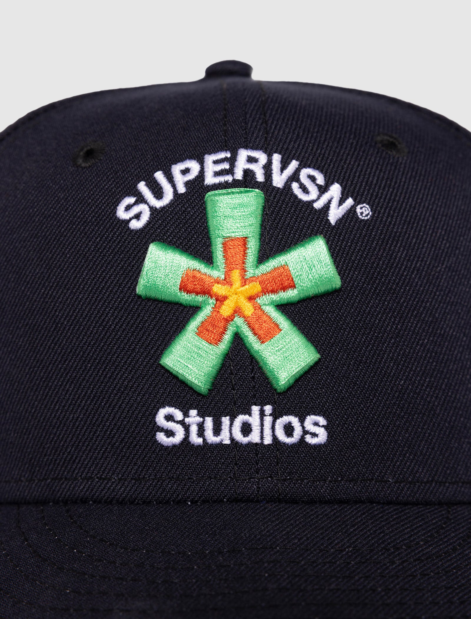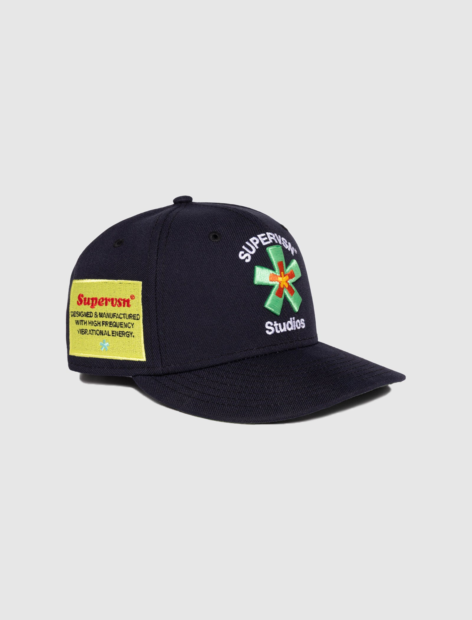 Polyester baseball cap. Flat brim. Embroidered logo and text at front. Embroidered brand patch and logo at sides. Embroidered logo text at back.