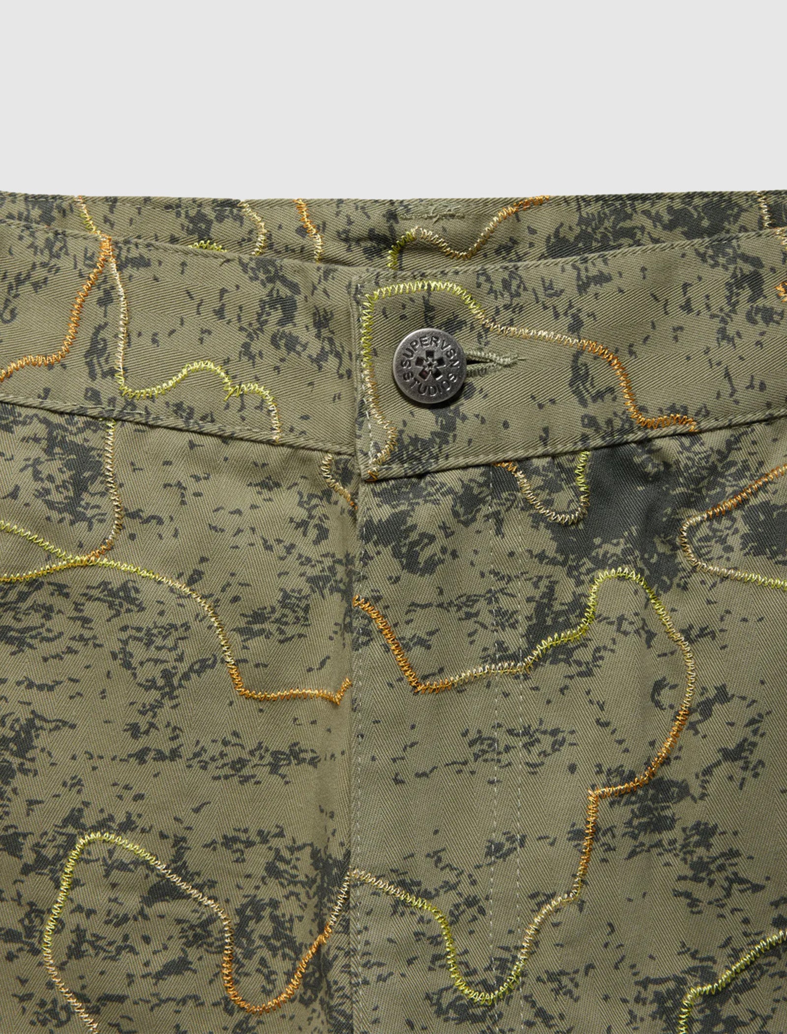 Relaxed-fit straight leg pants. Two pockets at front. Two flap pockets with engraved snap button closures at back. Logo tag at back pocket. Graphic and embroidered camo prints throughout. Zip-fly button closure at front.