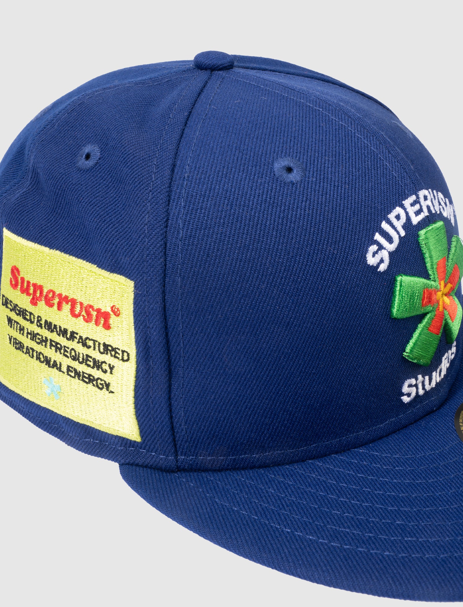 Polyester baseball cap. Flat brim. Embroidered logo and text at front. Embroidered brand patch and logo at sides. Embroidered logo text at back.