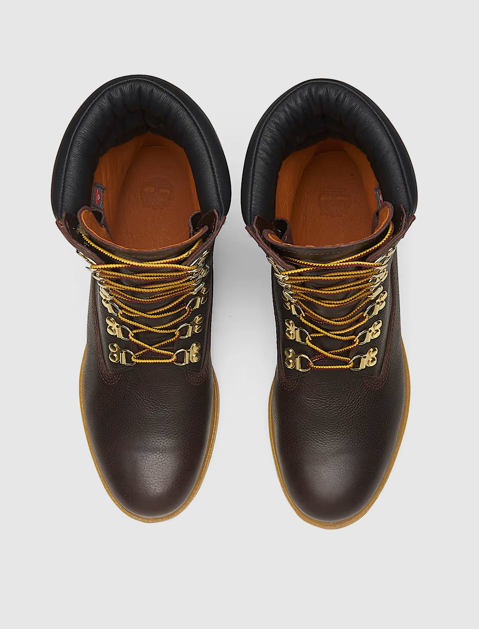 High top boot. Full grain leather upper. Padded leather collar. Gold-tone D-ring eyelets. Front lacing. Logo motif insert on the outer heel. Leather tongue. Fully waterproof upper. Steel shank for arch support. Vibram rubber lug sole.